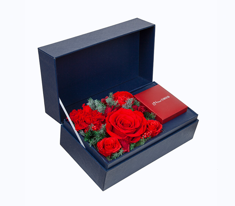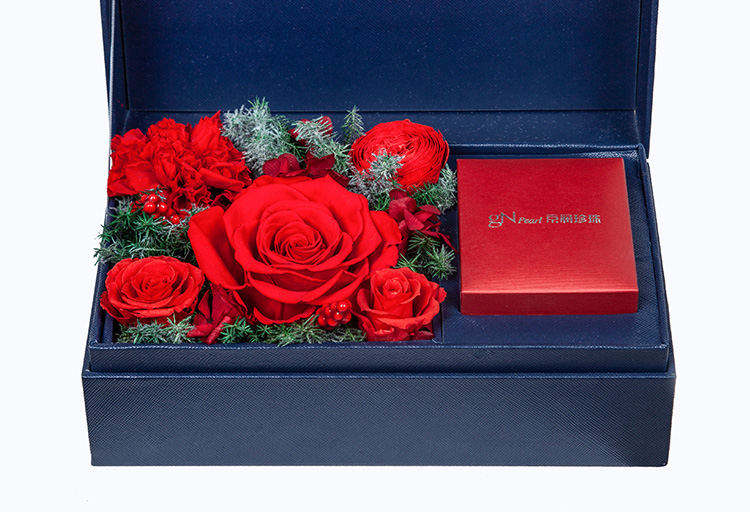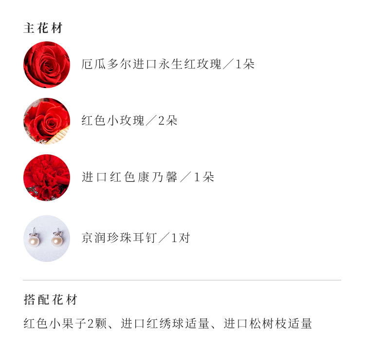 厄瓜多尔进口永生红玫1朵(直径6-7CM)、红色小玫瑰2朵、进口红色康乃馨1朵、红色小果子2颗、进口红绣球适量、进口松树枝适量;搭配授权正品京润珍珠925银耳钉
