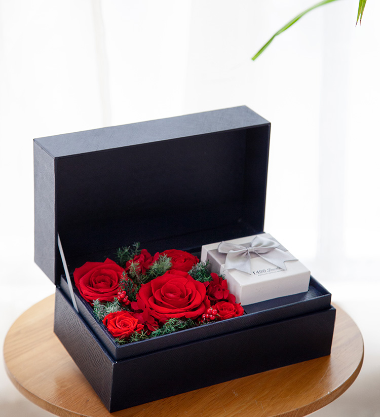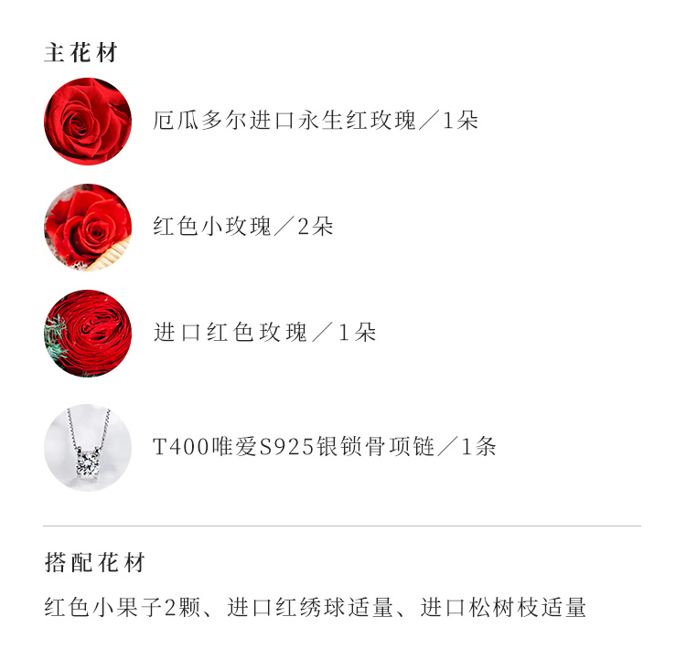 厄瓜多尔进口永生红玫1朵(直径6-7CM)、红色小玫瑰2朵、进口红色永生玫瑰1朵、红色小果子2颗、进口红绣球适量、进口松树枝适量;搭配T400唯爱S925银锁骨项链