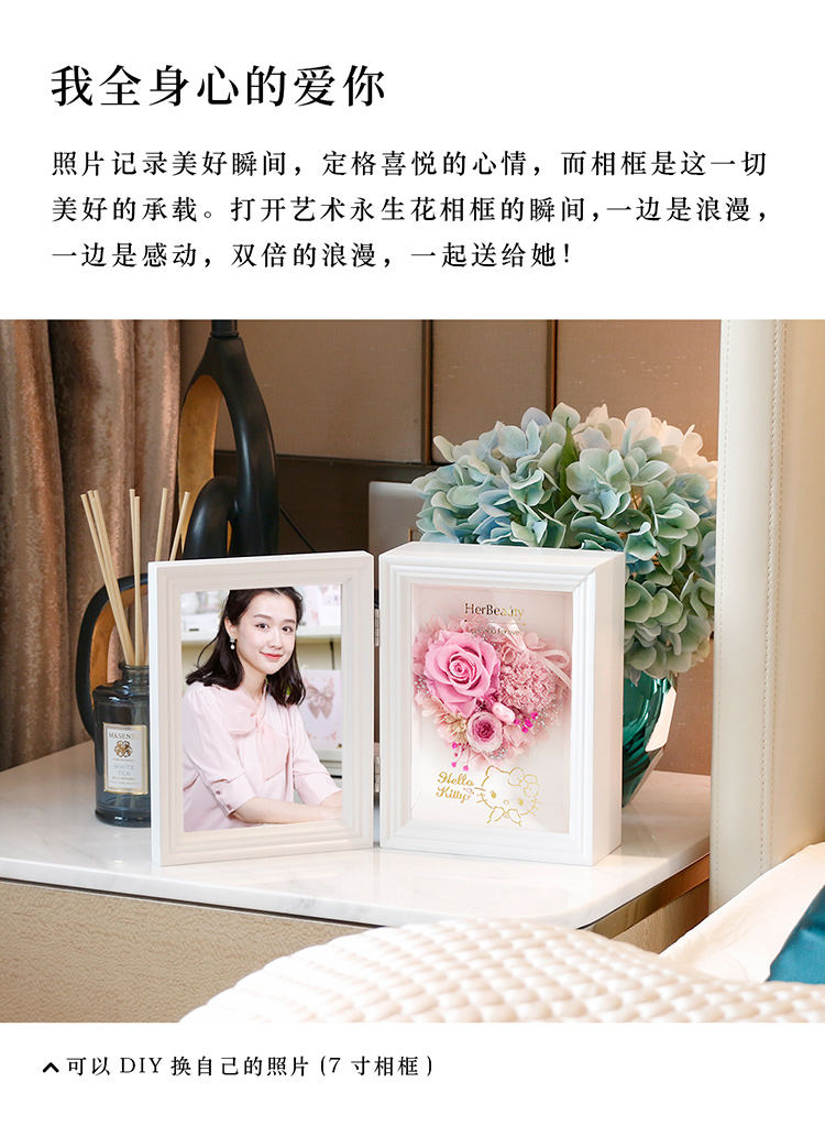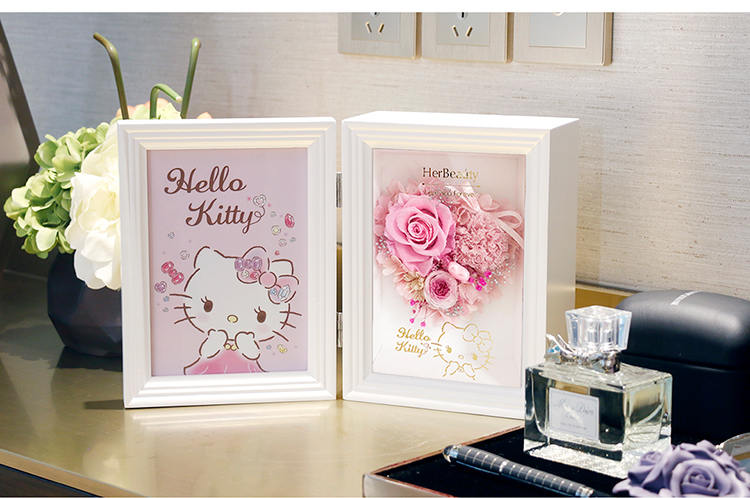 授权正品,Hello Kitty永生玫瑰花(心型)实木礼盒+相框