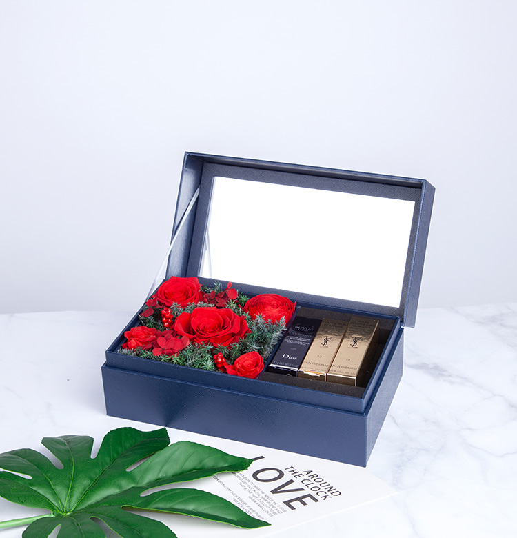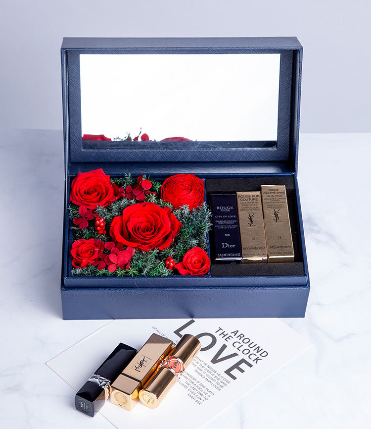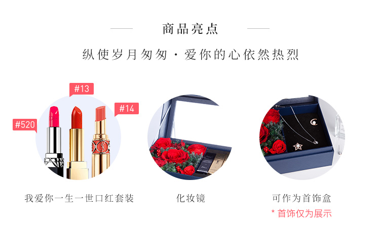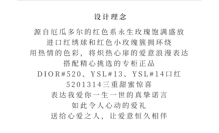 立减8元厄瓜多尔进口永生红玫1朵(直径6-7CM)、红色小玫瑰2朵、进口红色永生玫瑰1朵、红色小果子2颗、进口红绣球适量、进口松树枝适量;搭配专柜正品迪奥Dior#520 圣罗兰Ysl#13 圣罗兰Ysl#14口红