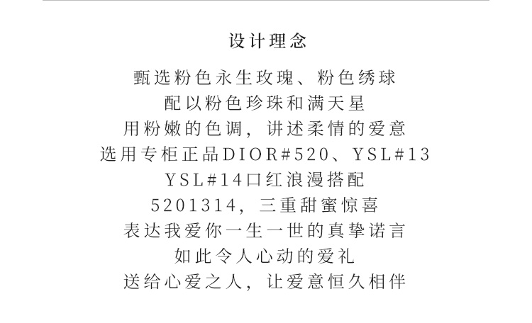 立减8元厄瓜多尔进口永生粉玫1朵(直径6-7CM)、粉色小玫瑰2朵、进口粉色永生玫瑰1朵、进口粉色珍珠2颗、进口粉绣球适量、进口满天星适量;搭配专柜正品迪奥Dior#520、圣罗兰Ysl#13、圣罗兰Ysl#14口红(口红色号组合寓意:5201314)