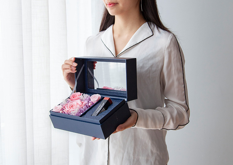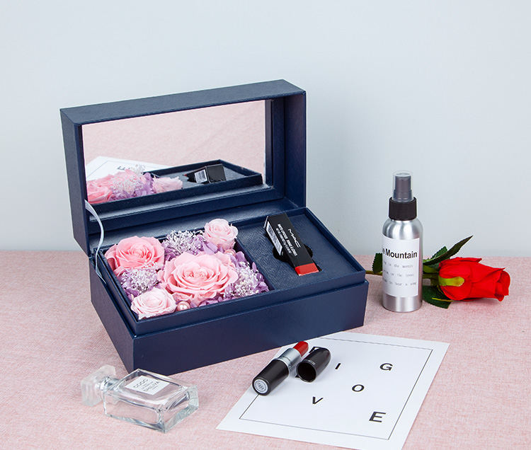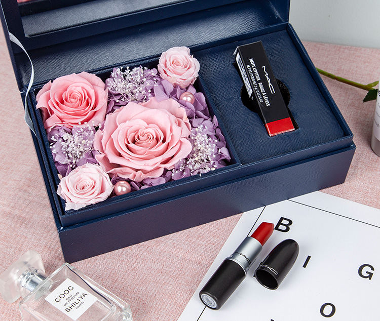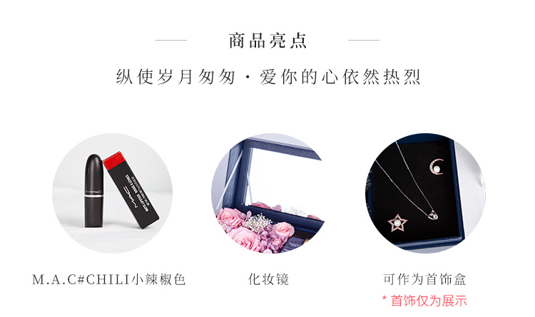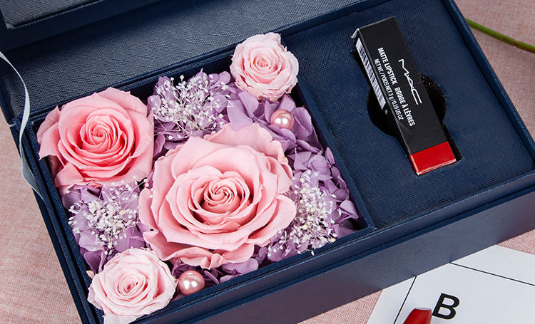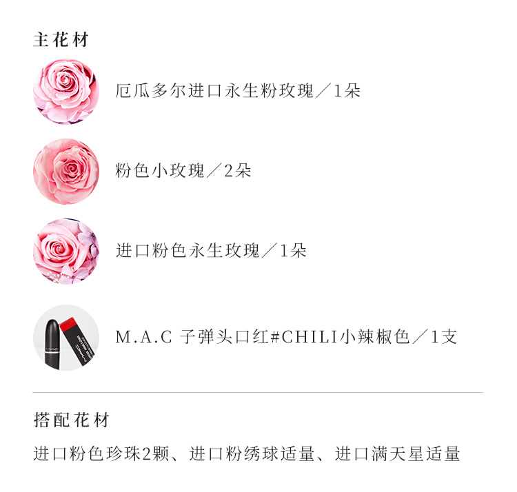 厄瓜多尔进口永生粉玫1朵(直径6-7CM)、粉色小玫瑰2朵、进口粉色永生玫瑰1朵、进口粉色珍珠2颗、进口粉绣球适量、进口满天星适量;搭配M.A.C子弹头口红#chili小辣椒色/秀智色(M.A.C柔感哑光唇膏,子弹头外观、奶油味的性感唇膏,明星色,魅力尽显!!!)
