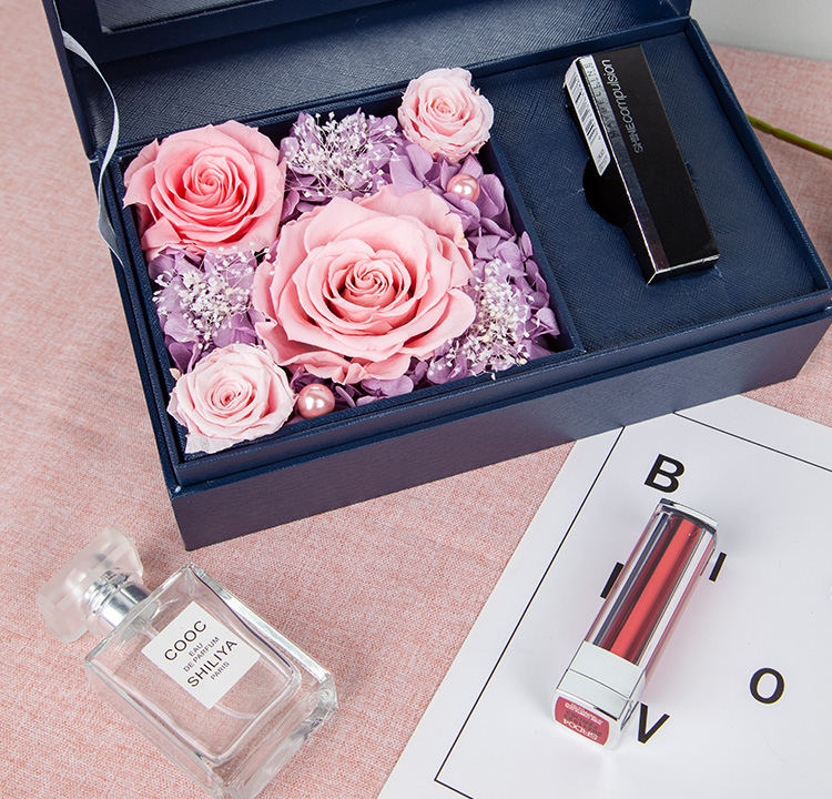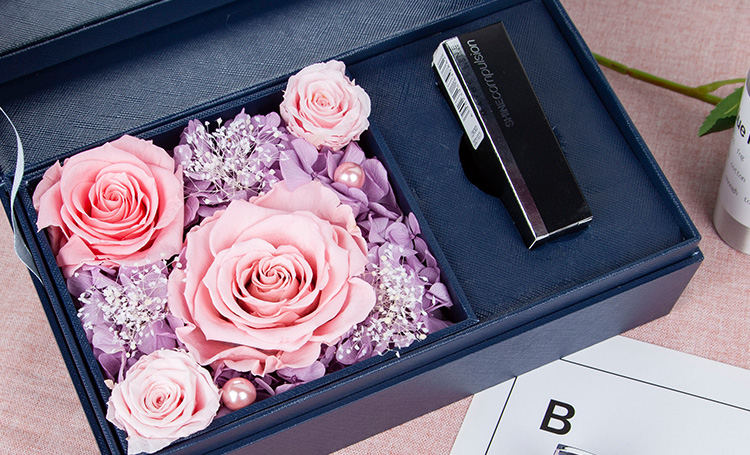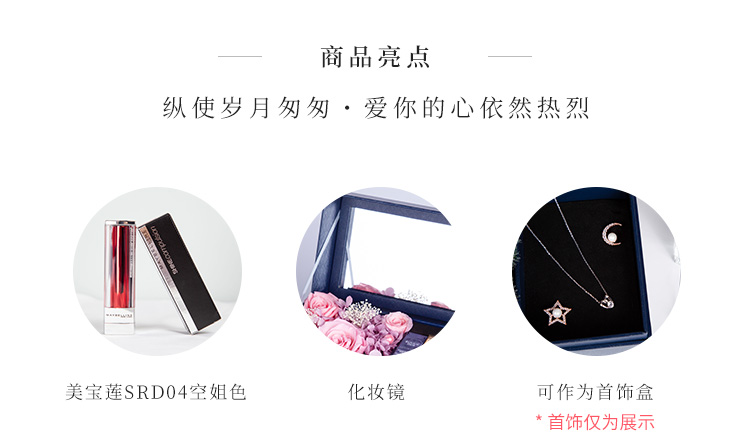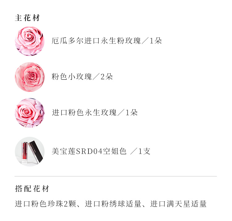 厄瓜多尔进口永生粉玫1朵(直径6-7CM)、粉色小玫瑰2朵、进口粉色永生玫瑰1朵、进口粉色珍珠2颗、进口粉绣球适量、进口满天星适量;搭配专柜正品美宝莲绝色持久纵情耀系列#SRD04空姐色口红(星钻小灯管唇膏,经典莹润,星钻闪耀,饱满鲜活正红色,人气满满!!!)