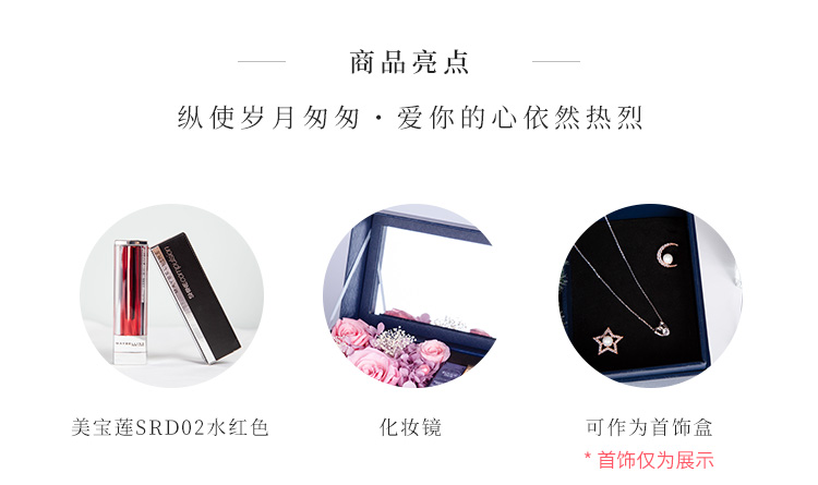 厄瓜多尔进口永生粉玫1朵(直径6-7CM)、粉色小玫瑰2朵、进口粉色永生玫瑰1朵、进口粉色珍珠2颗、进口粉绣球适量、进口满天星适量;搭配专柜正品美宝莲绝色持久纵情耀系列#SRD02水红色口红(星钻小灯管唇膏,经典莹润,星钻闪耀,人气断货色!!!)