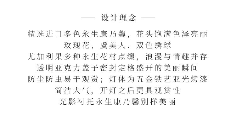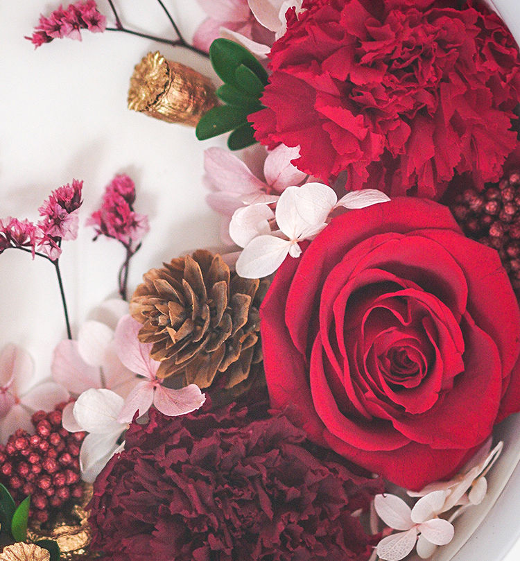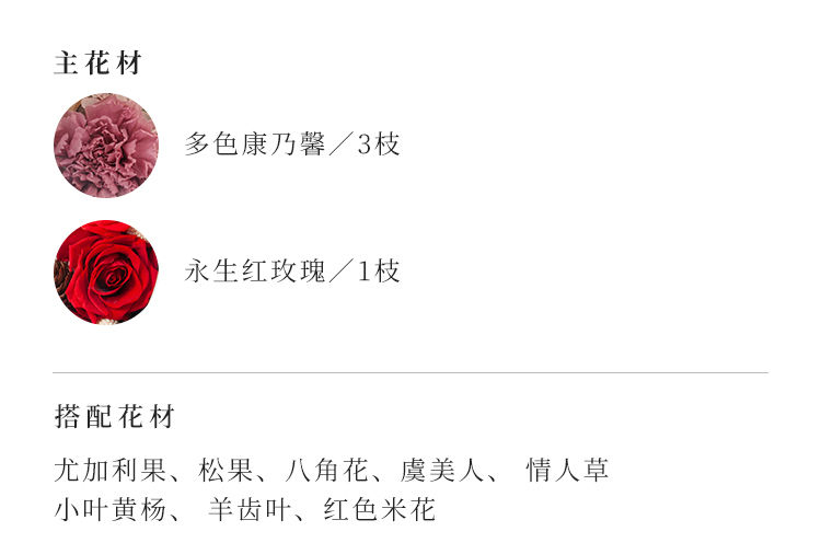 花材:进口多色永生康乃馨、永生花玫瑰、双色永生绣球、尤加利果、松果、八角花、虞美人、情人草、小叶黄杨、羊齿叶、红色米花