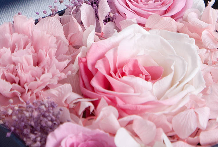 日本进口大地玫粉双色玫瑰1朵,粉紫色玫瑰1朵,浅粉紫康乃馨1朵,粉紫色奥斯丁1朵,香槟粉黄金球1朵,粉色绣球适量、白色绣球适量,紫色渐变满天星适量;搭配专柜正品香奈儿可可香水50ml(EDP),高档蓝色定制多功能礼盒。