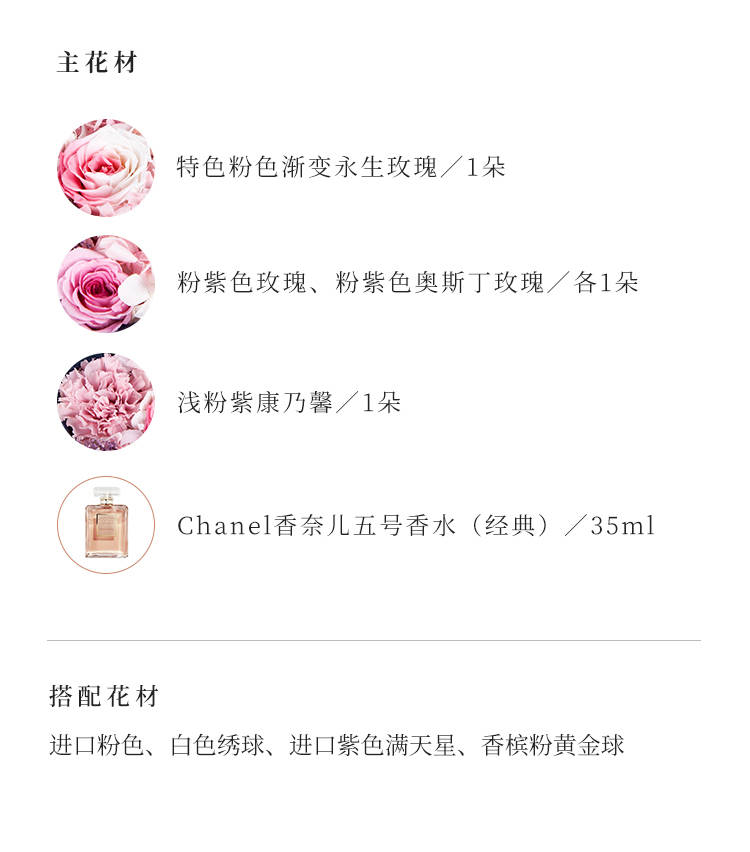日本进口大地玫粉双色玫瑰1朵,粉紫色玫瑰1朵,浅粉紫康乃馨1朵,粉紫色奥斯丁1朵,香槟粉黄金球1朵,粉色绣球适量、白色绣球适量,紫色渐变满天星适量;搭配专柜正品香奈儿五号香水经典35ml(EDP),高档蓝色定制多功能礼盒。