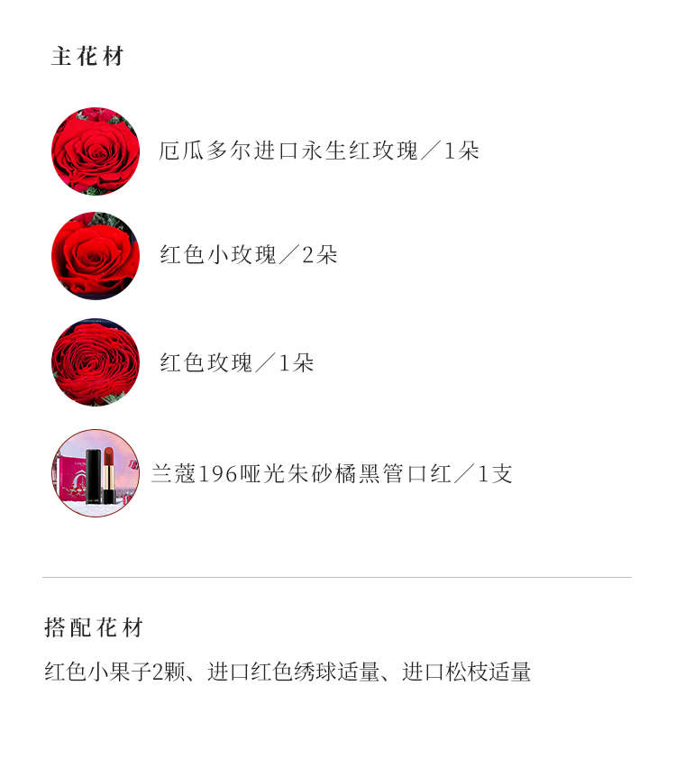 立减8元厄瓜多尔进口永生红玫1朵(直径6-7CM)、红色小玫瑰2朵、进口红色永生玫瑰1朵、红色小果子2颗、进口红绣球适量、进口松树枝适量;搭配专柜正品兰蔻LANCOME#196朱砂橘哑光口红(DRAMA MATTE非凡哑光,人气断货王,“予你美运一整年,从此人生开挂”! )。高档蓝色定制多功能礼盒(永生花盒+升级款带化妆镜+带首饰盒功能)。