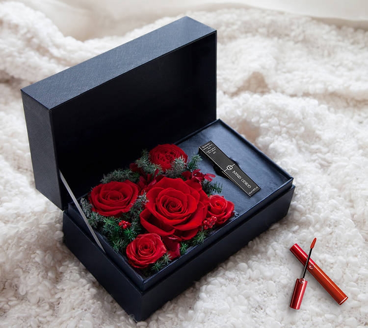 一度绝版的人气色号又回归了。高档蓝色定制多功能礼盒(永生花盒+升级款带化妆镜+带首饰盒功能)。