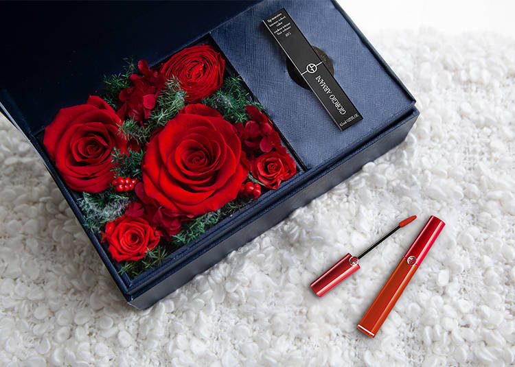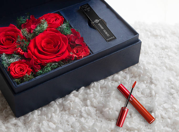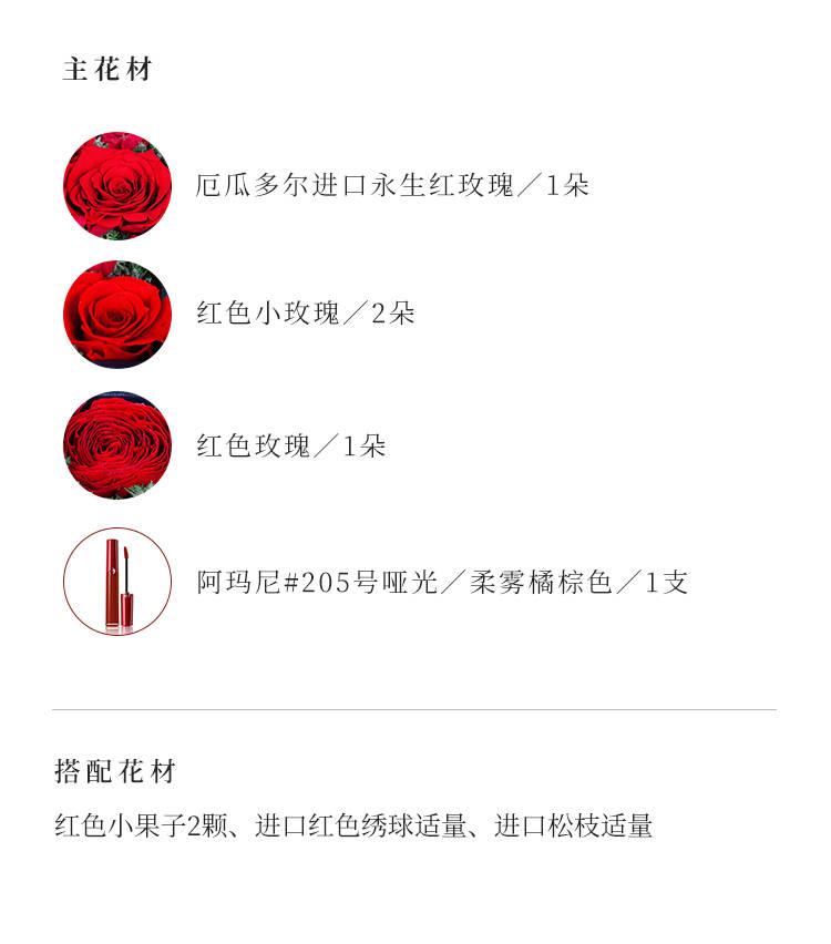 立减8元厄瓜多尔进口永生红玫1朵(直径6-7CM)、红色小玫瑰2朵、进口红色永生玫瑰1朵、红色小果子2颗、进口红绣球适量、进口松树枝适量;搭配专柜正品阿玛尼#205红管哑光唇釉/柔雾橘棕色,超slay女团色