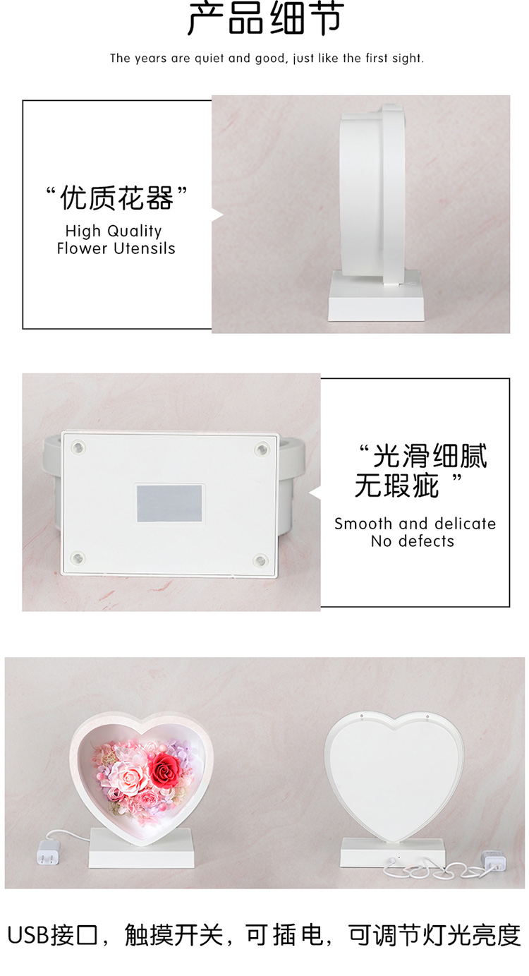 心形台灯,USB接口,触摸开关,可充电,可调节灯光亮度。永生花材:西瓜粉玫瑰,浅粉玫瑰,粉色小玫瑰,粉色小珠子,粉绣球,紫绣球,配草配叶适量