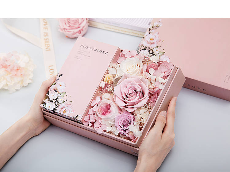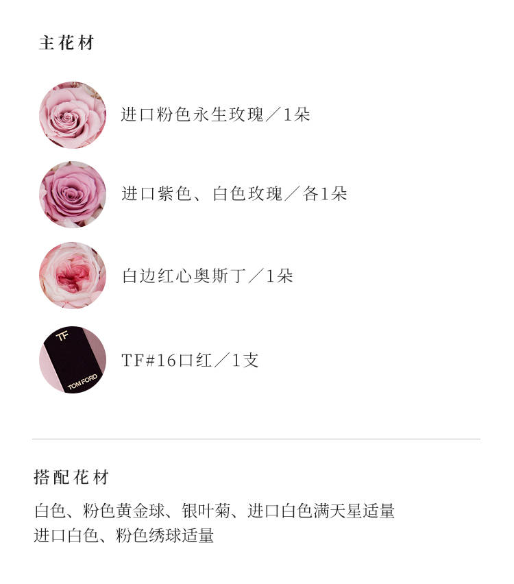 立减8元进口粉色永生玫瑰1朵(直径6-7cm),进口紫色玫瑰1朵(直径4-5cm),进口白色玫瑰1朵(直径4-5cm),白边红心奥斯丁1朵;白色、粉色黄金球,银叶菊,进口白色满天星适量,进口白色、粉色绣球适量。搭配汤姆福特#16口红(斯嘉丽红,经典款,滋润型),以及全新设计的高定花漾礼盒,呈现与众不同的气质,是真挚浪漫的表达!
