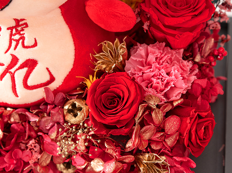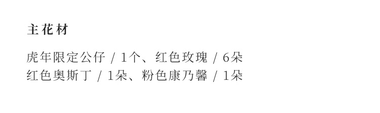 花材:虎年限定公仔1个,红色玫瑰6朵,红色奥斯丁1朵,粉色康乃馨1朵,红色绣球适量,金色八角花、金黄色麦穗、金色十字果、金色虞美人适量,红色果果适量,红色水晶草、红色蓬莱松适量,绿色大叶尤加利叶适量