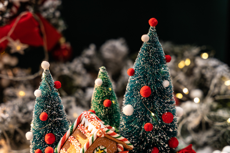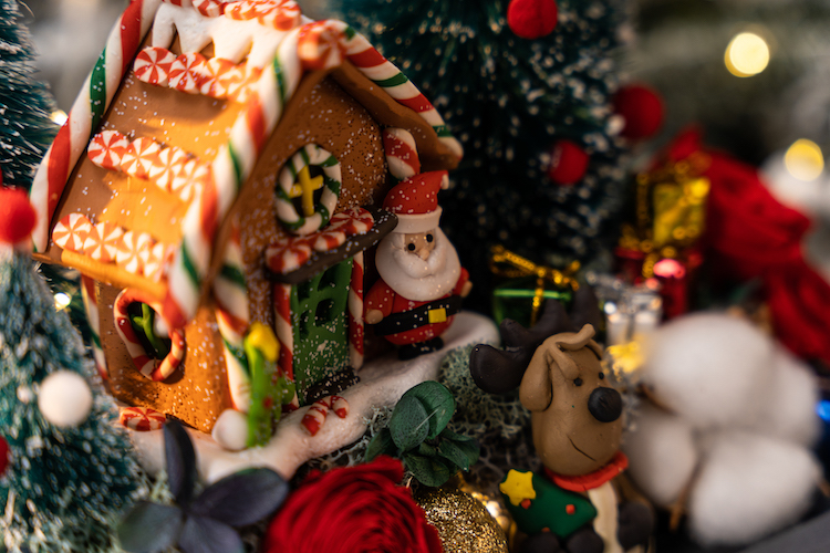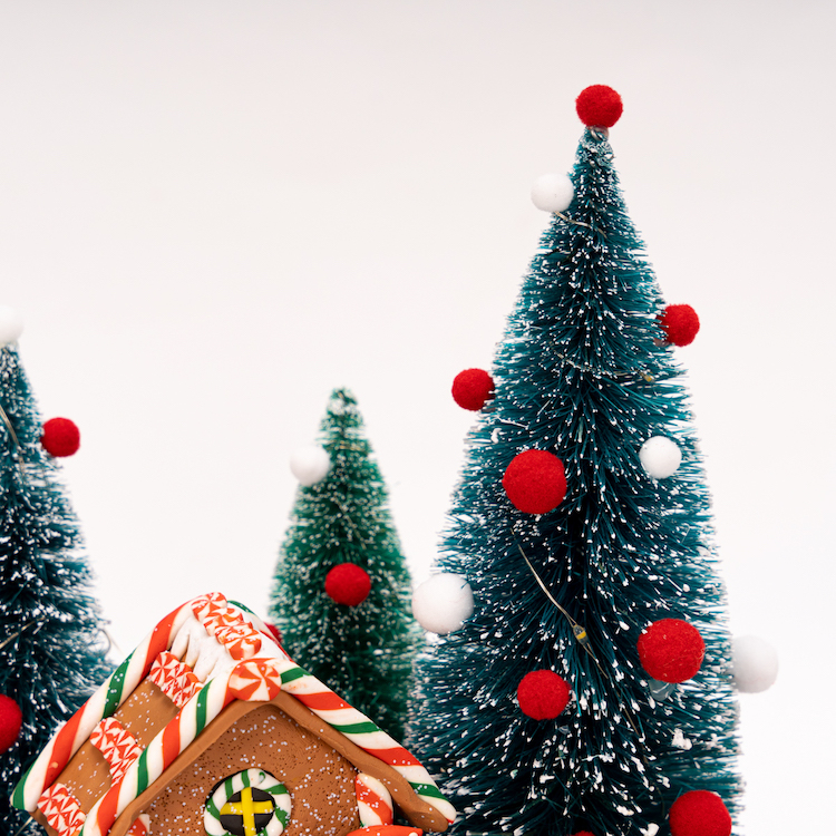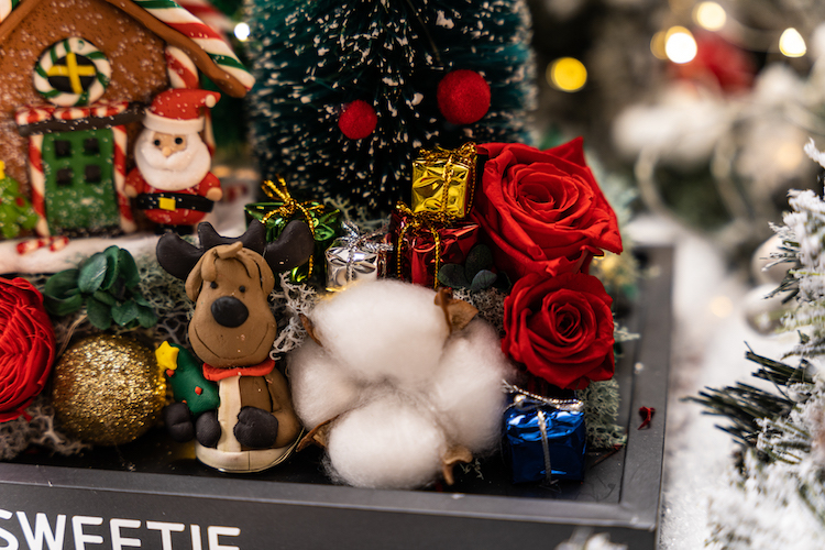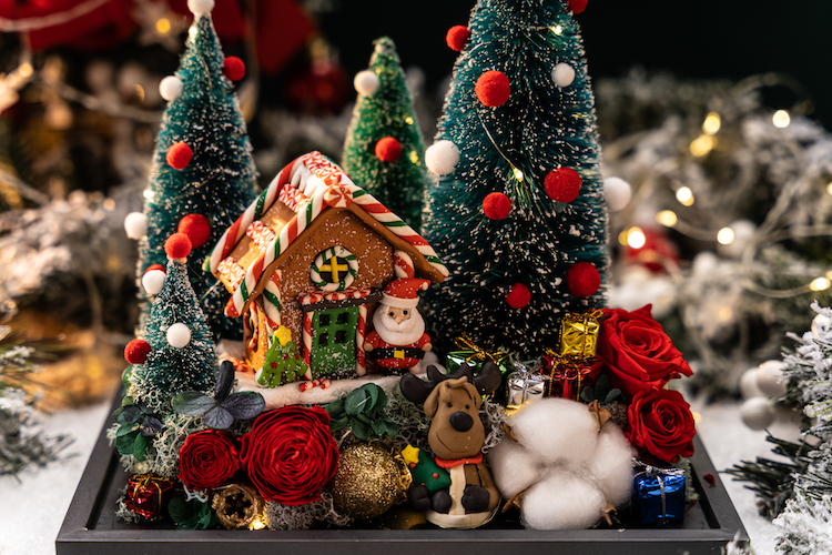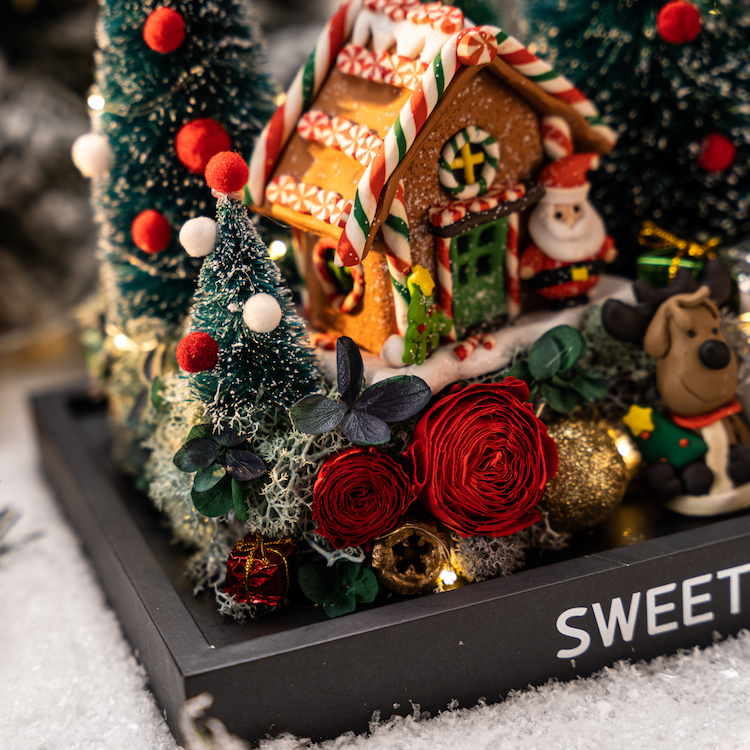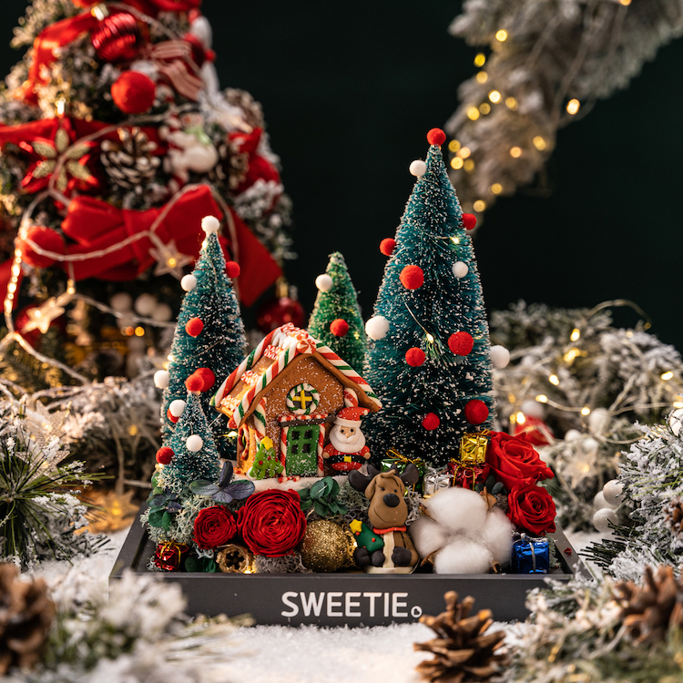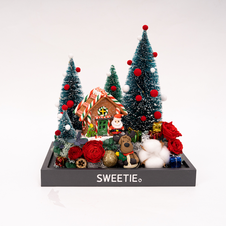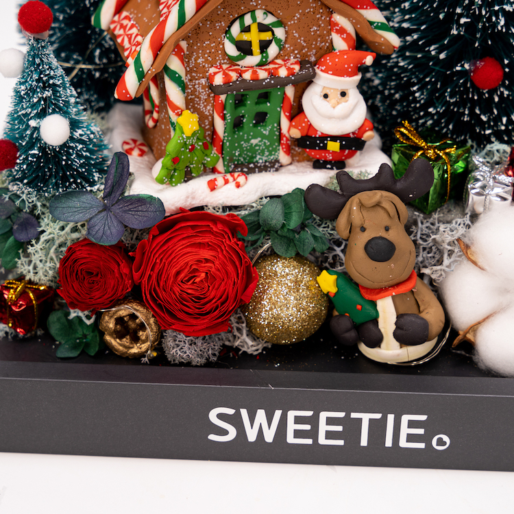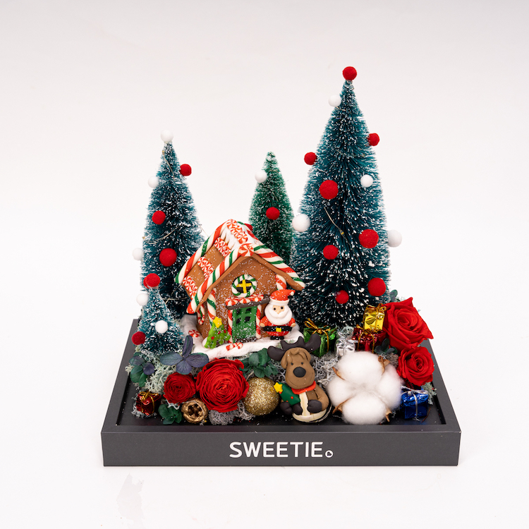 配材:绣球,苔藓,落地小松果,小毛球,立体小礼包,迷你雪花,仿真圣诞树,软陶插件,软陶小屋,尤加利果,棉花头,圣诞金球