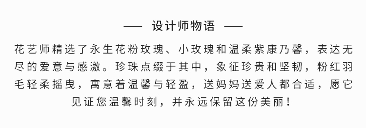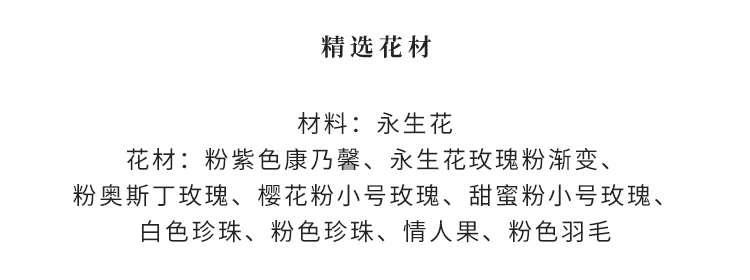 粉紫色康乃馨、永生花玫瑰粉渐变、粉奥斯丁玫瑰、樱花粉小号玫瑰、甜蜜粉小号玫瑰、白色珍珠、粉色珍珠、情人果、粉色羽毛
