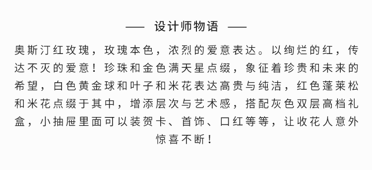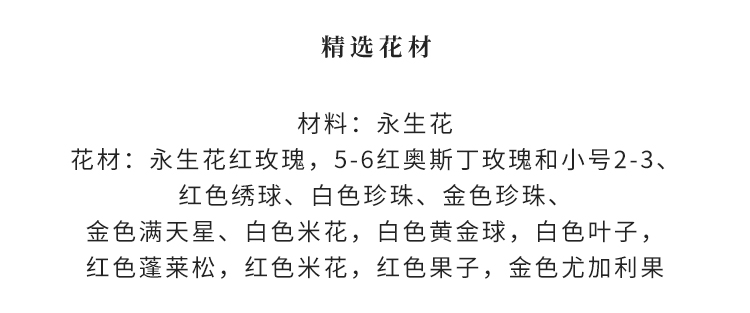花材:永生花红玫瑰,红奥斯丁玫瑰、红色绣球、白色珍珠、金色珍珠、金色满天星、白色米花,白色黄金球,白色叶子,红色蓬莱松,红色米花,红色果子,金色尤加利果
