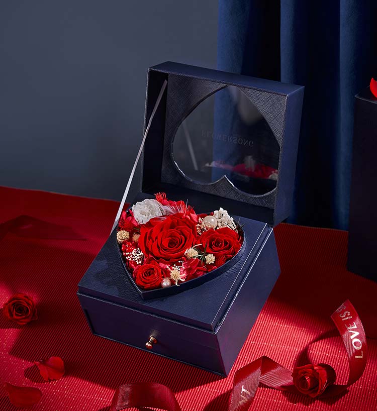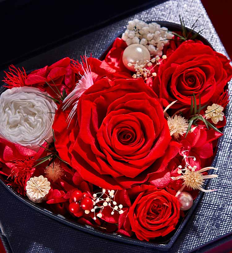 立减8元永生花 花材:永生花红玫瑰、5-6红奥斯丁玫瑰和小号2-3红色玫瑰、白心奥斯汀、红色绣球、白色珍珠、白色满天星、白色米花、红色蓬莱松、红色果子、绿色叶子、白色羽毛、小白花、虞美人、情人果白色