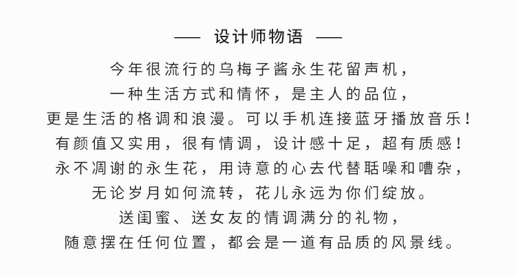 首页 > 礼品 >永生花 > 永生花留声机蓝牙音箱/乌梅子酱