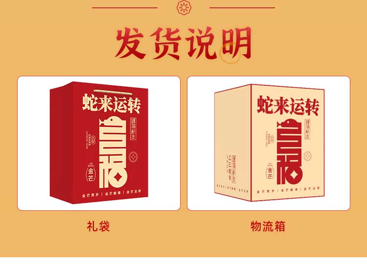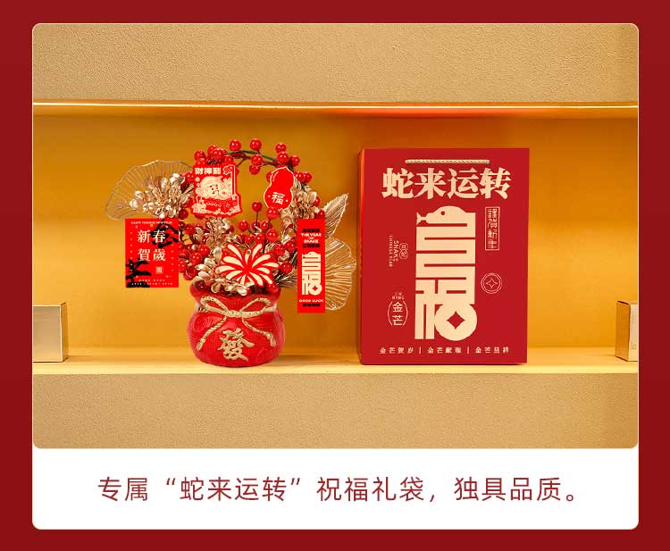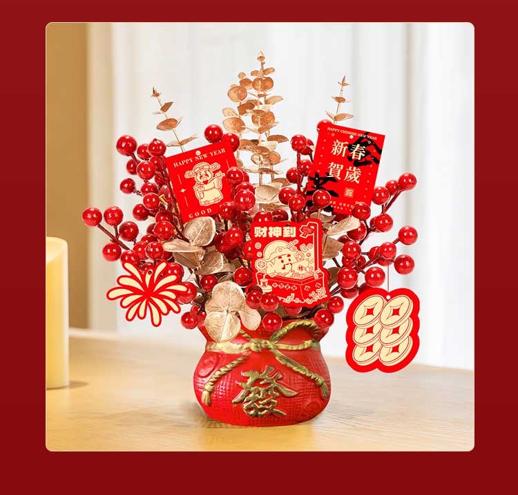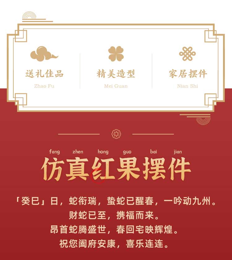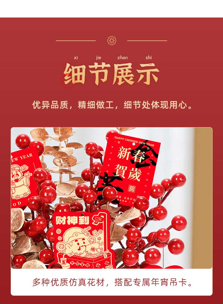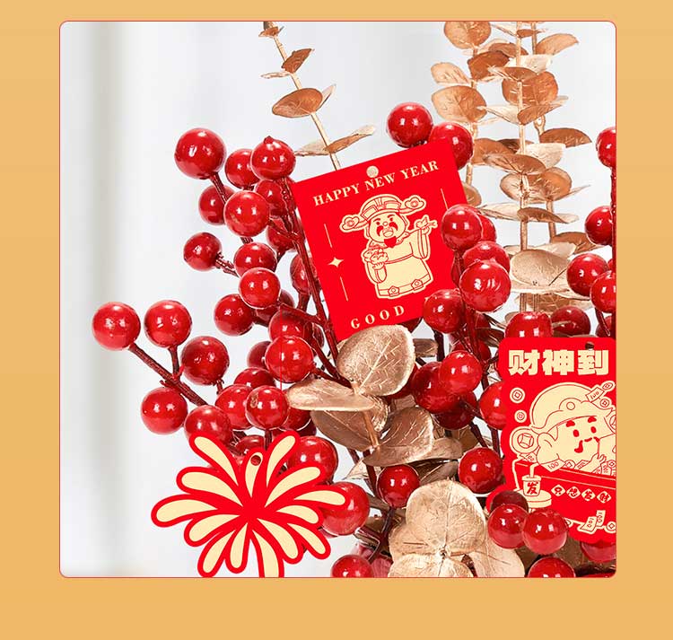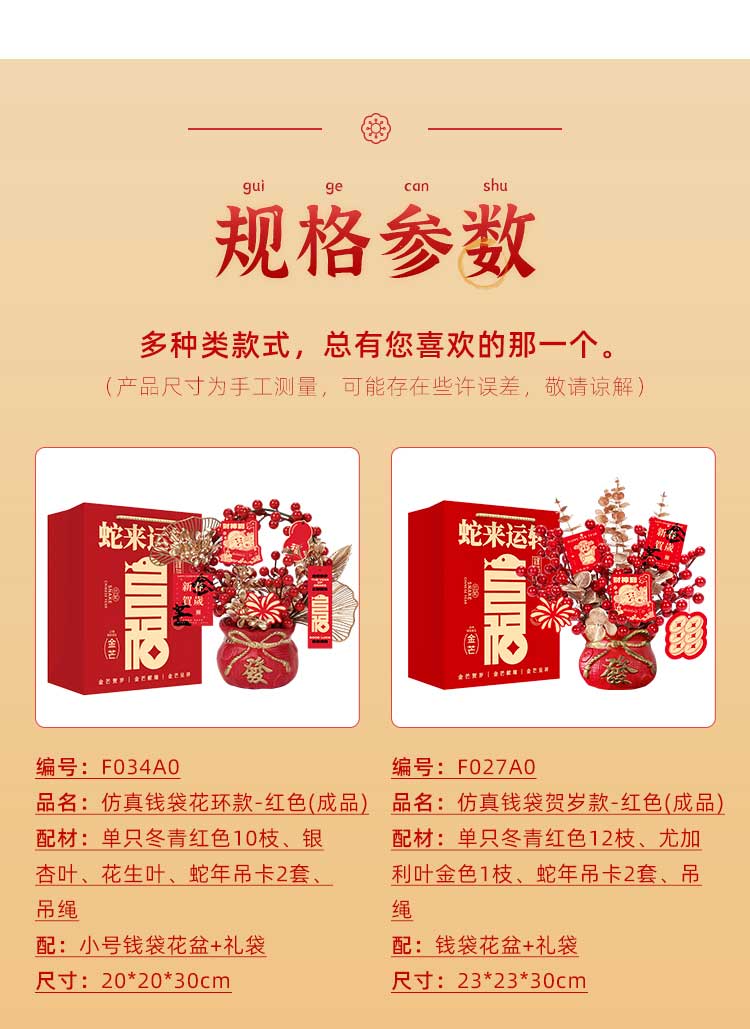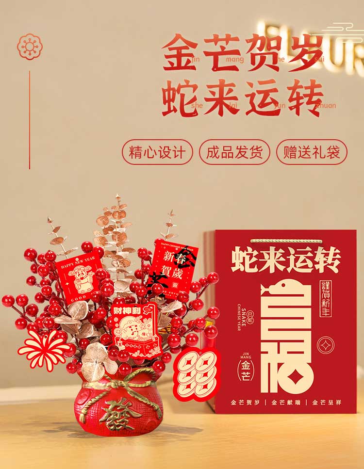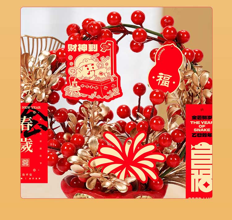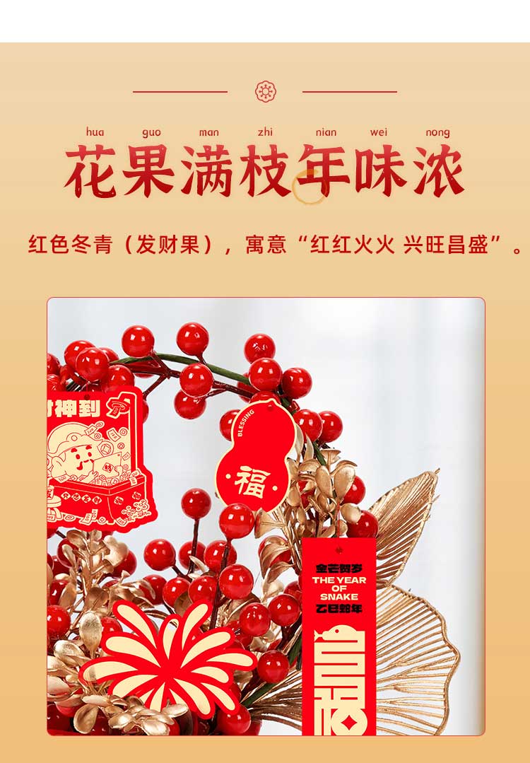 配材(仿真花): 单只冬青红色12枝、尤加利叶金色1枝、蛇年吊卡2套、吊绳