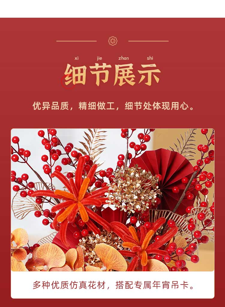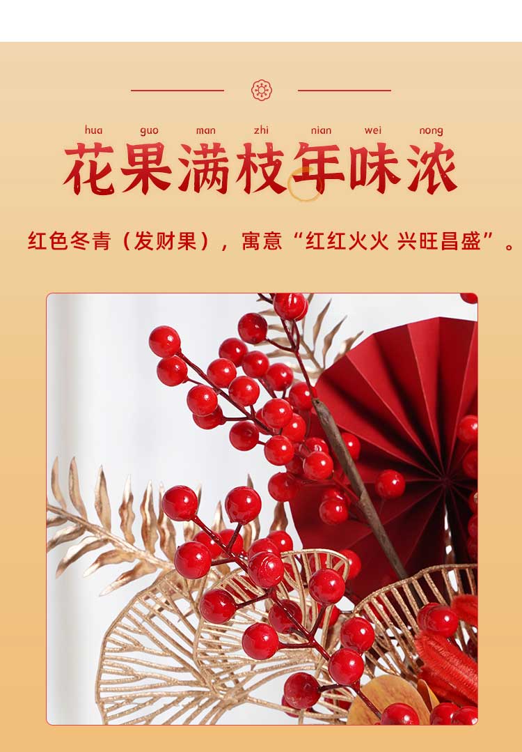 配材(仿真花): 6叉冬青6枝、波斯蕨、花生叶、蛇年吊卡、吊绳、折扇