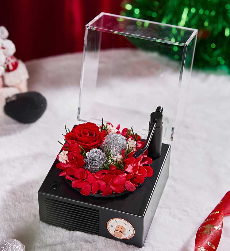 [永生花留声机蓝牙音箱] 红色绣球,白色米花,圣诞松柏