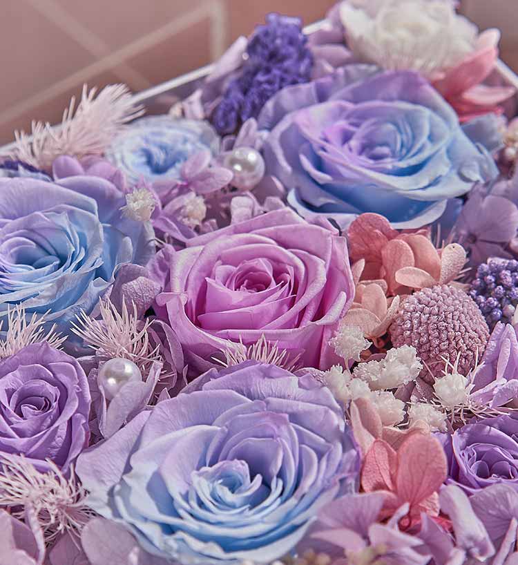 永生花材料:蓝紫渐变玫瑰3朵(4-5cm),兔尾草紫罗兰色,小米花蓝紫色,白边粉心奥斯丁玫瑰,粉紫色玫瑰1朵,香芋紫小玫瑰2朵,蓝色小奥斯丁玫瑰,白色玫瑰,白色米花,白色满天星,粉色蓬莱松,白色珍珠,粉色绣球,浅紫色绣球,紫色黄金球,勿忘我紫色