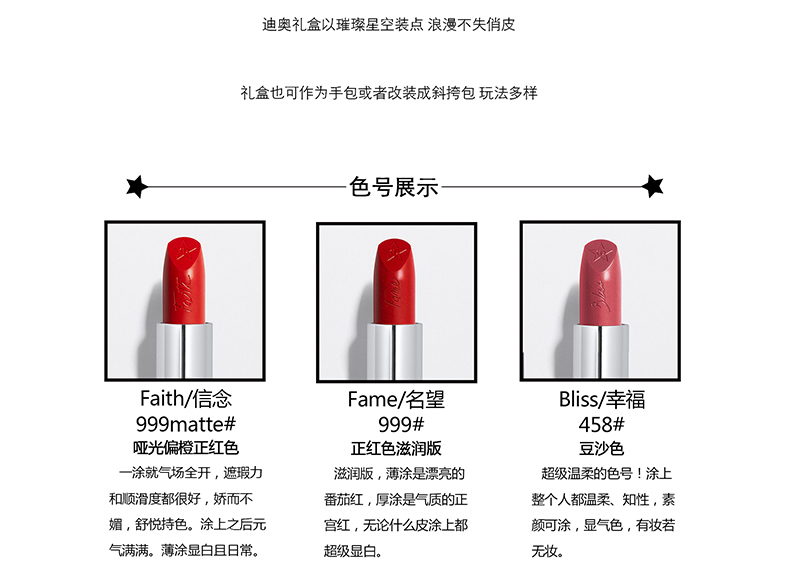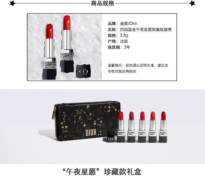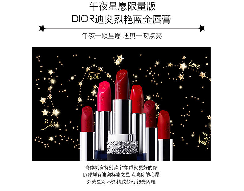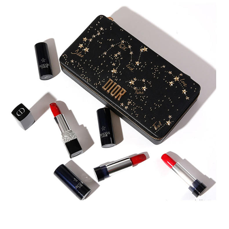 立减8元高订唇膏礼盒灵感来自秀场。饰钉镶嵌成金色璀璨星空,与美丽心愿交相辉映。限量星空包(可作为时尚手包或改装成斜挎包)+5支迪奥经典烈艳蓝金唇膏,哑光或缎光妆效随心搭配不同场合: #520 Feel Good, #666 Matte Kisss, #775 Hyde Park, #888 Strong Matte 和 #999 传奇红!