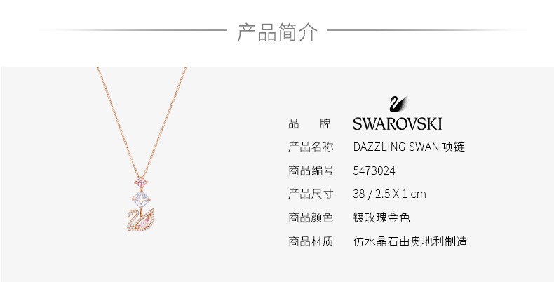 立减8元品牌:施华洛世奇(SWAROVSKI),商品名称:DAZZLING SWAN项链(编号: 5473024,尺寸:38cm),商品颜色:镀玫瑰金色,商品材质:仿水晶石由奥地利制造。这款精致巧究的镀玫瑰金色项链可为装扮注入含蓄雅致的魅力,同时散发清新浪漫的气息。天鹅标志装饰以亮丽的粉红色全切割Swarovski仿水晶身躯,搭配简洁俐落的透明色密镶Swarovski仿水晶线条,彰显出施华洛世奇的傲人设计。