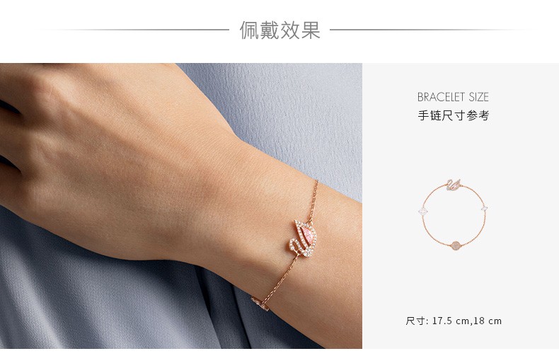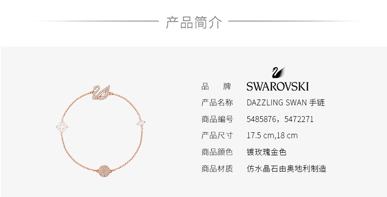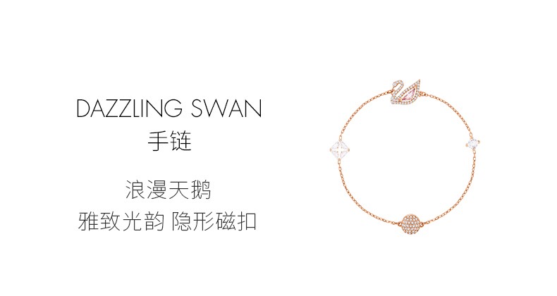 立减8元品牌:施华洛世奇(SWAROVSKI),商品名称:DAZZLING SWAN手链(编号: 5472271,尺寸:18cm),商品颜色:镀玫瑰金色,商品材质:仿水晶石由奥地利制造。这款精致巧究的镀玫瑰金色手链可为装扮注入含蓄雅致的魅力,同时散发清新浪漫的气息。天鹅标志装饰以亮丽的粉红色全切割Swarovski仿水晶身躯,搭配简洁俐落的透明色密镶Swarovski仿水晶线条,彰显出施华洛世奇的傲人设计。独特华丽,引人注目的设计,巧妙搭配同款项链,彰显独特气质。