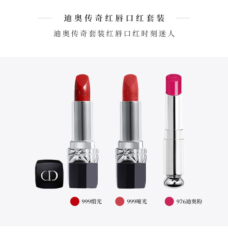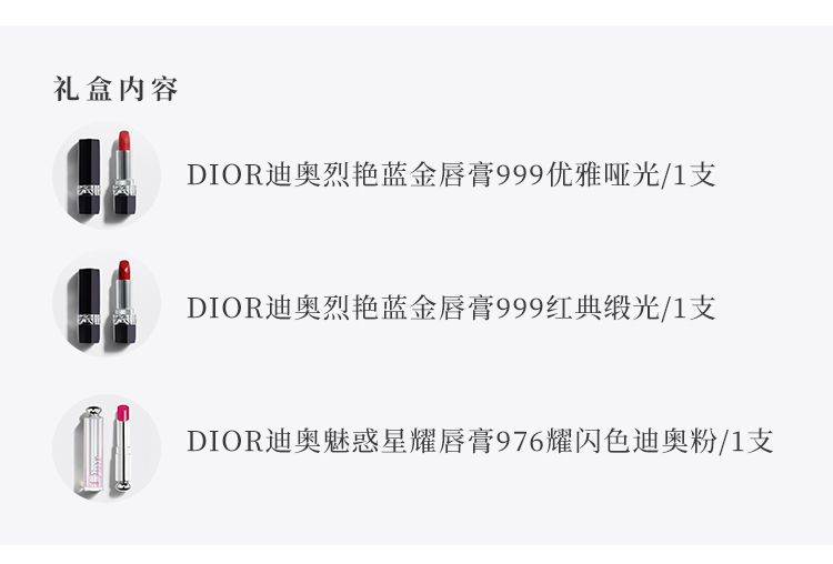 立减8元专柜正品Dior口红套装内含三大明星单品:迪奥烈艳蓝金唇膏#999优雅哑光 传奇红唇;迪奥烈艳蓝金唇膏#999红典缎光 传奇红唇;迪奥魅惑星耀唇膏976耀闪色泽/迪奥粉(广告女神色)。
