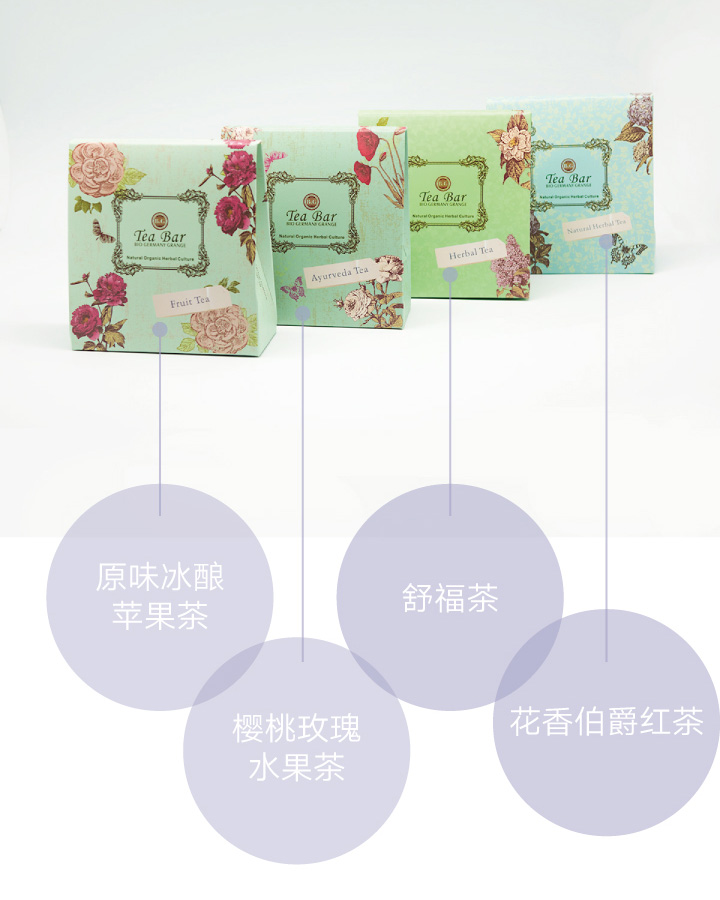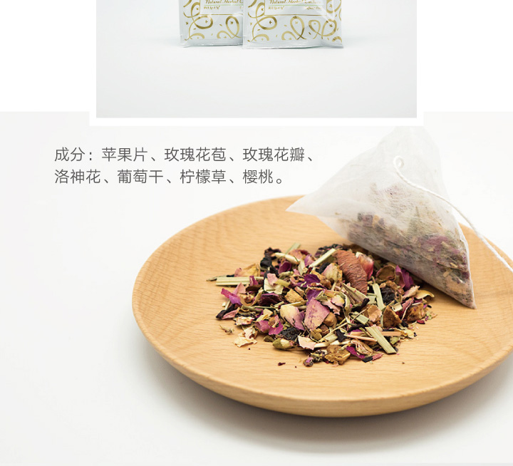 净含量:经典舒福茶2.5g/袋,冰酿苹果茶4g/袋,樱桃玫瑰水果茶4g/袋,花香伯爵红茶3g/袋