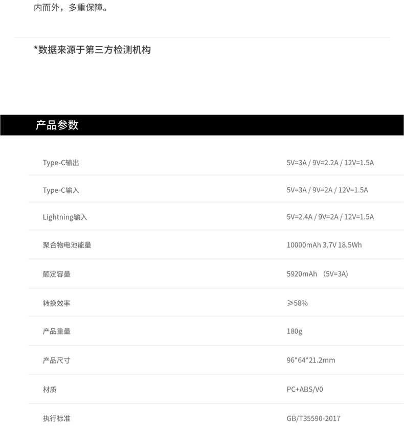 Type-C输出:5V=3A/9V=2.2A/12V=1.5A