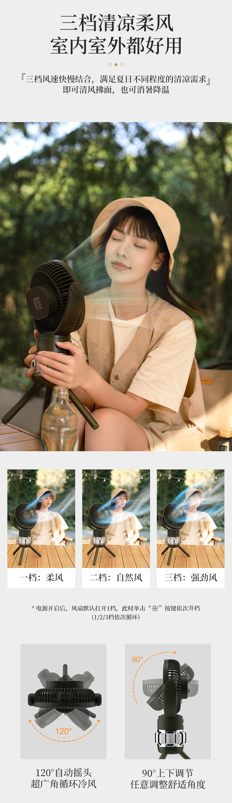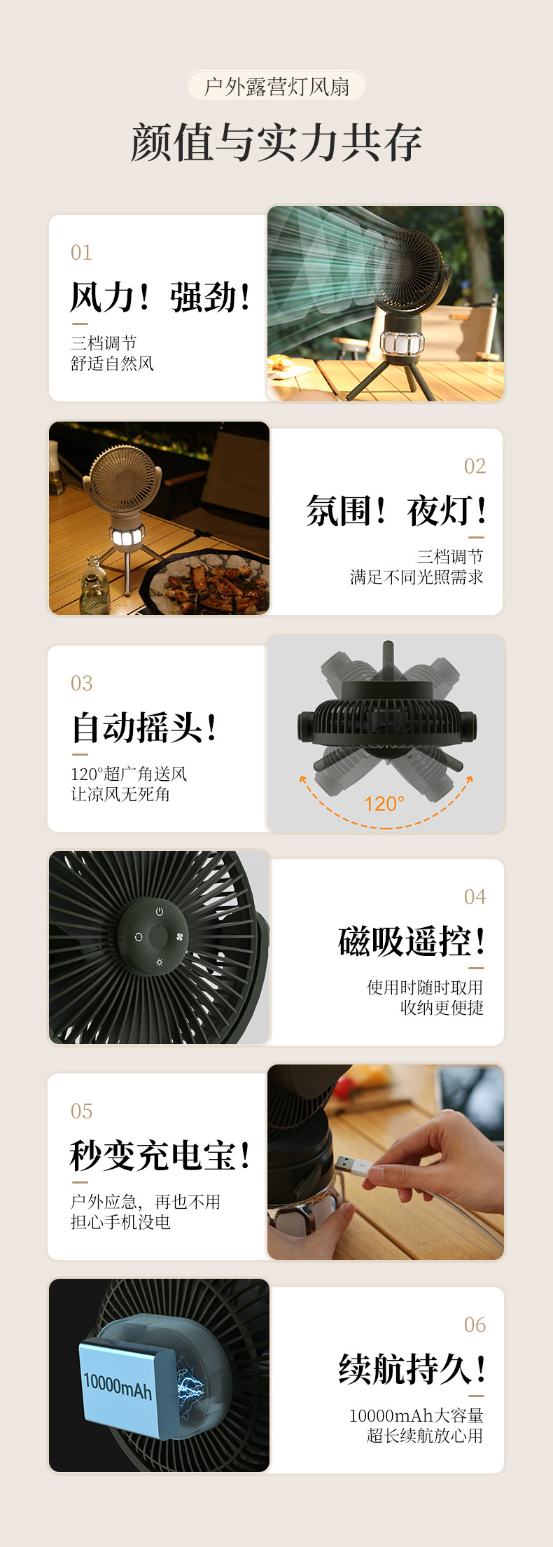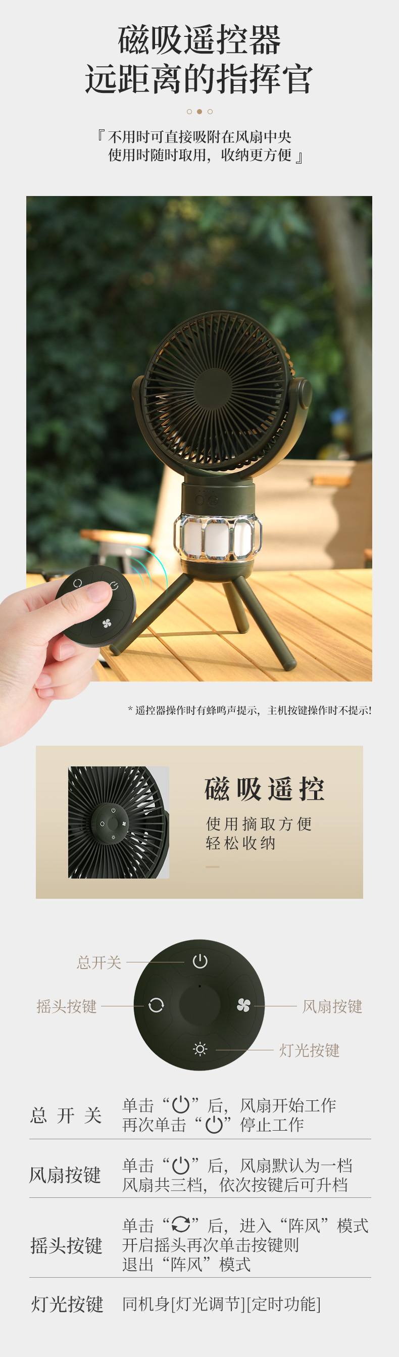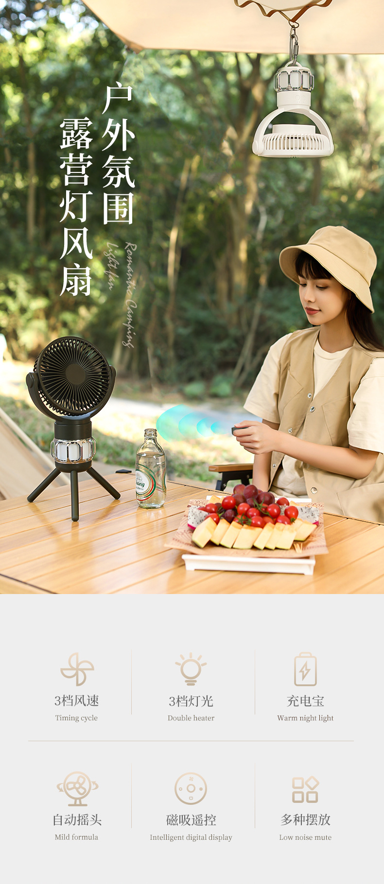 功能:自动摇头,露营灯,磁吸遥控,定时功能,可拆卸支架作吊扇,充电宝功能
