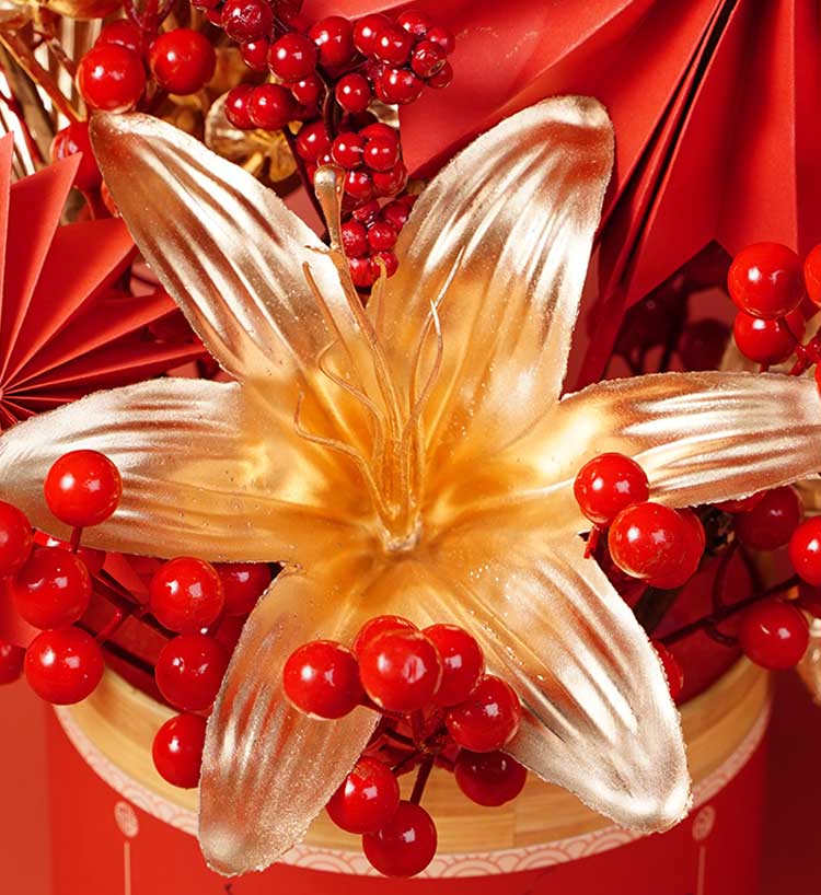 产品内容: 仿真花:冬青、金色蒲扇、金色红掌、金色百合、金色高枝七头梅花、
