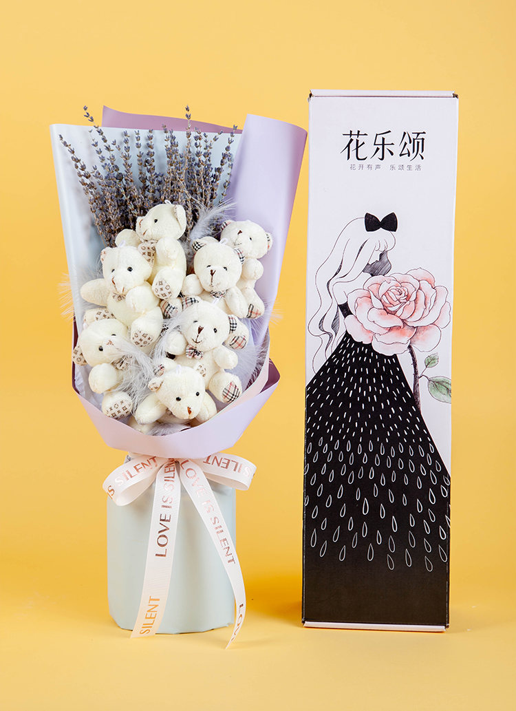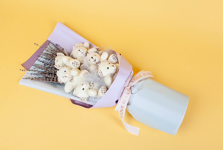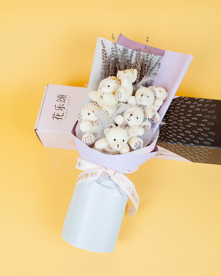 [可爱小白熊花束] 小熊花束:格子底坐姿熊7个