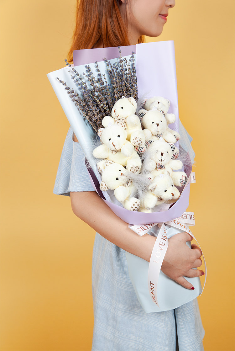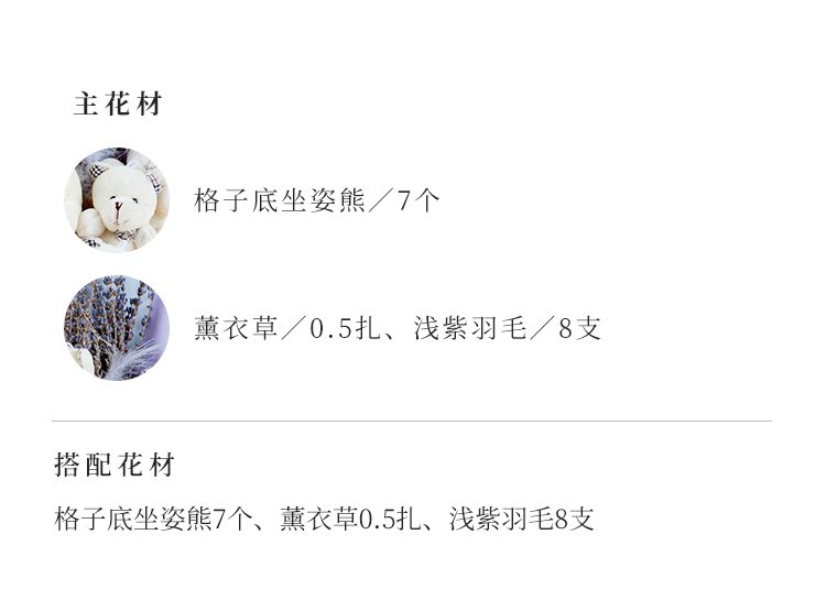 格子底坐姿熊7个、薰衣草0.5扎、浅紫羽毛8支
