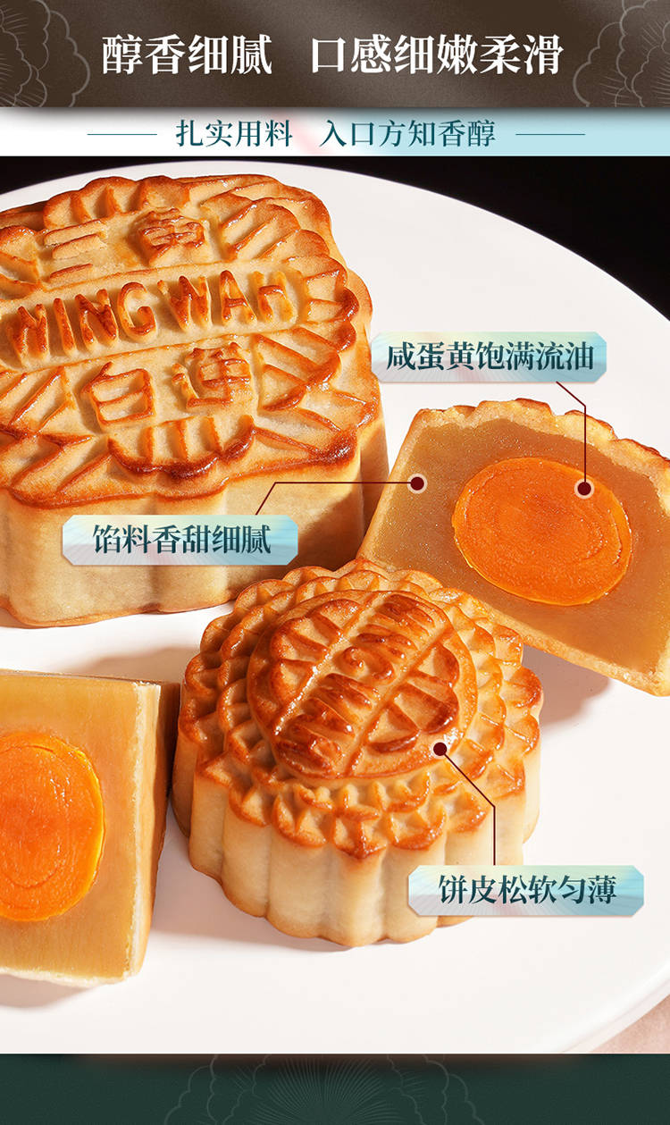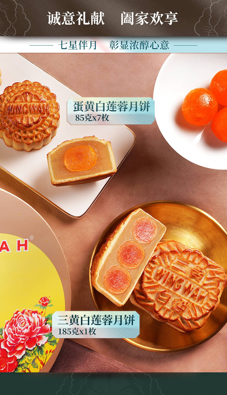 产品口味:蛋黄白莲蓉月饼85g*7个、三黄白莲蓉月饼185g*1个