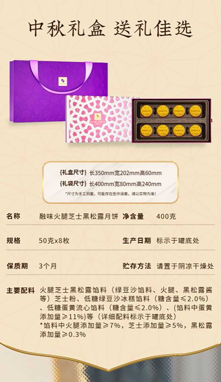 规格:融味火腿芝士黑松露月饼50g*8,共400g