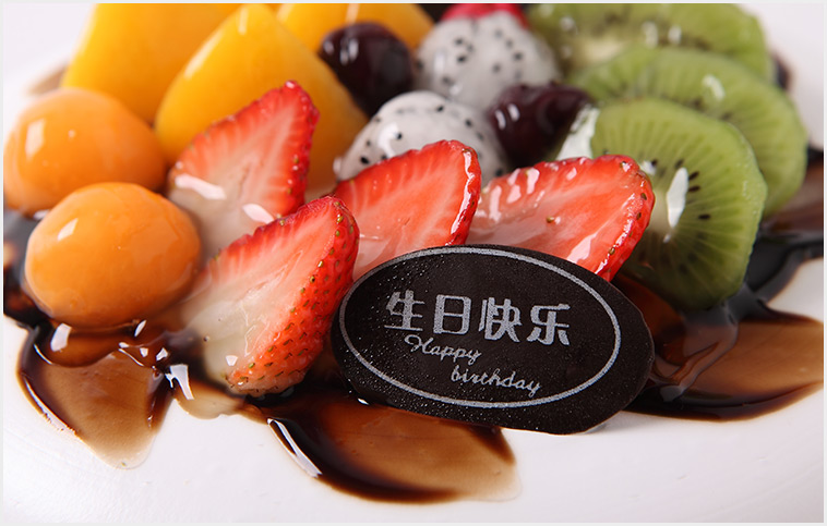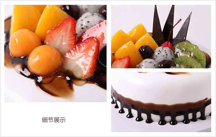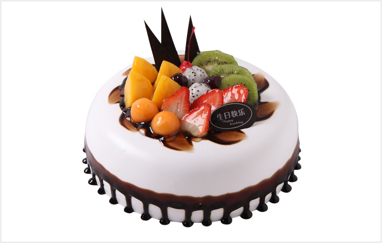 2磅(8寸)巧克力+水果蛋糕:欧式风格的奶油水果蛋糕,浓浓的巧克力酱浇汁,配以甜蜜的热带水果,充满了浪漫的风情。