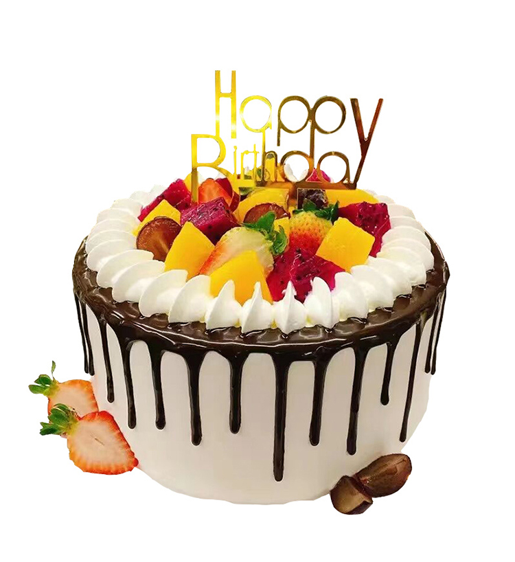 2磅(8寸)巧克力+水果蛋糕:欧式风格的奶油水果蛋糕,浓浓的巧克力酱浇汁,配以甜蜜的热带水果,充满了浪漫的风情。