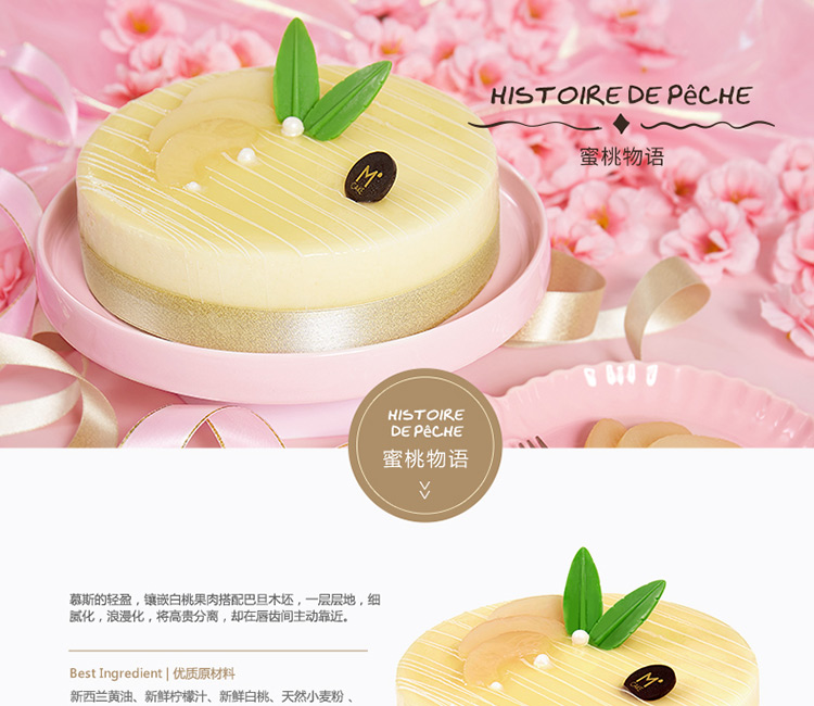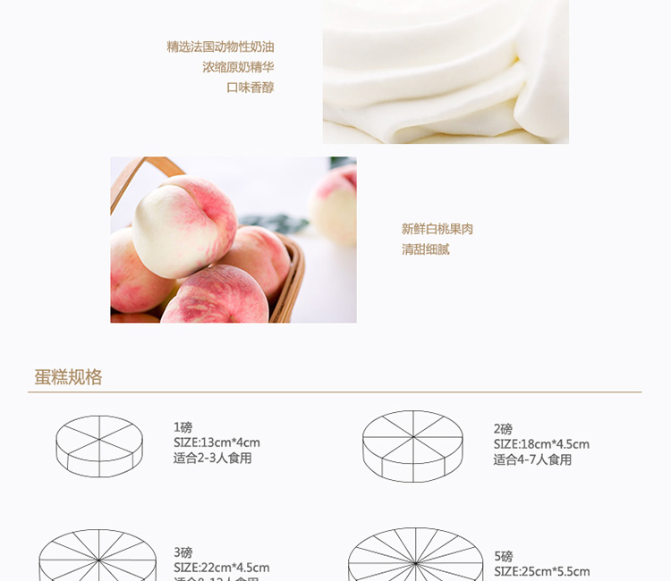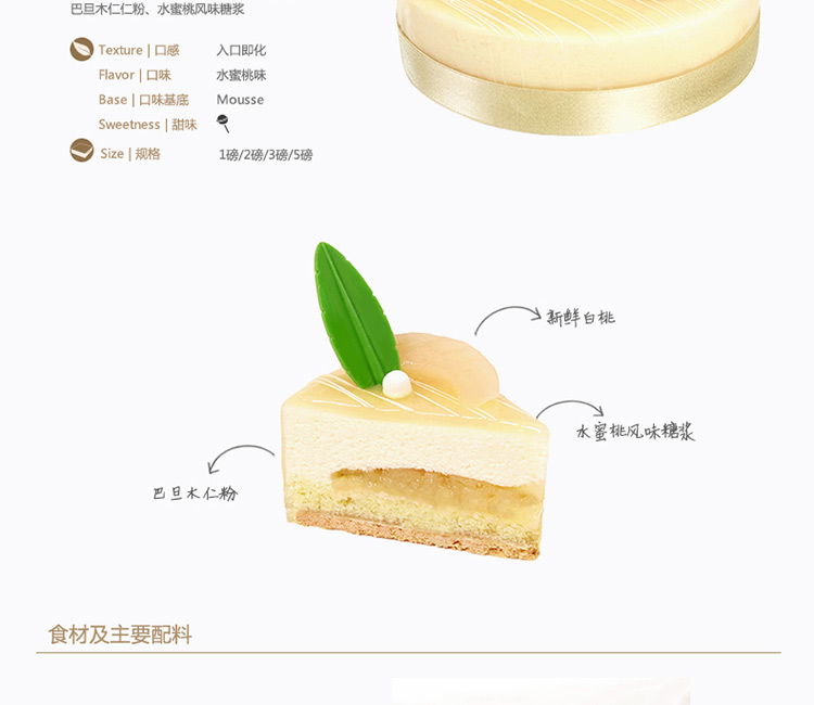 新西兰黄油,法国淡奶油,韩国幼砂糖,新鲜柠檬汁,新鲜白桃,天然小麦粉,巴旦木仁粉,水蜜桃风味糖浆,巴氏杀菌蛋液
