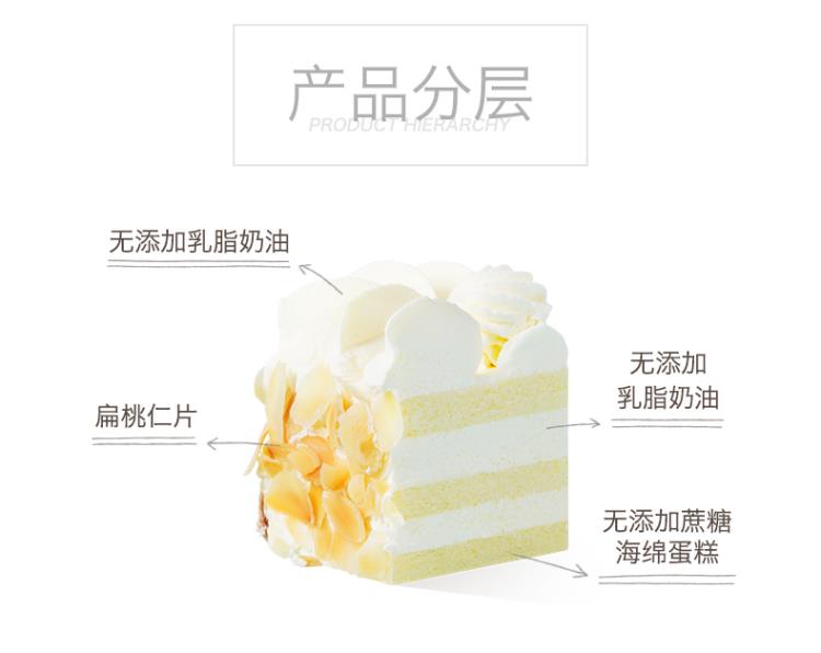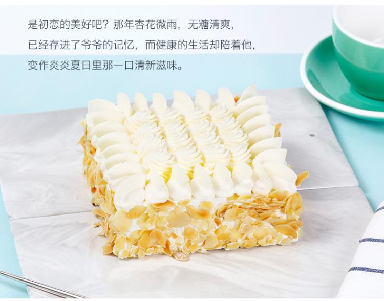 无添加蔗糖蛋糕 采用天然木糖醇取代了传统制作工艺所需的蔗糖,恰到好处的淡淡甜味让你在享受蛋糕美味的同时,又不用担心摄入过多的糖分。外部点缀的巴旦木片,口味清香,适合健康生活的你。