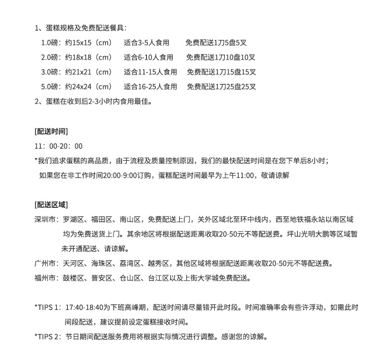 食用建议:建议收到美味蛋糕后,于6小时之内食用,即可品尝到最佳风味。