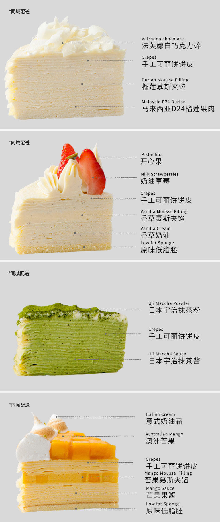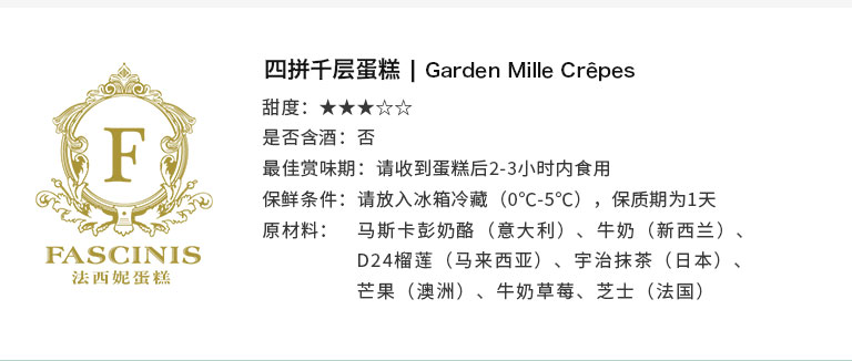 原材料:马斯卡彭奶酪(意大利)、牛奶(新西兰)、24D榴莲(马来西亚)、宇治抹茶(日本)、芒果(澳洲)、牛奶草莓、芝士(法国)