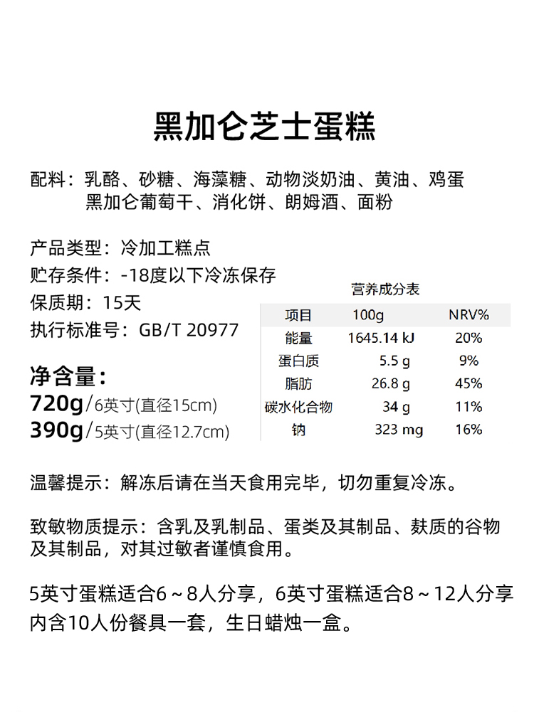 乳酪、土鸡蛋、海藻糖、淡奶油、黄油、黑加仑葡萄、兰姆酒、消化饼干