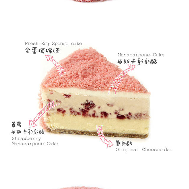 乳酪、马斯卡彭、淡奶油、细砂糖、消化饼干、土鸡蛋、冻干草莓粒、草莓酒、消化饼干