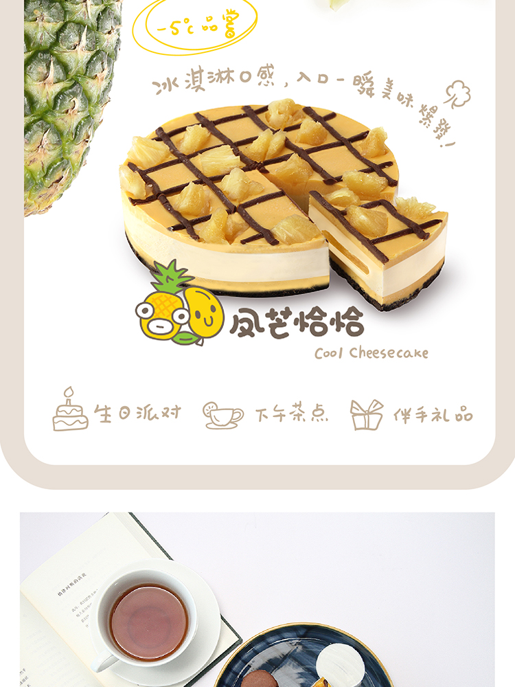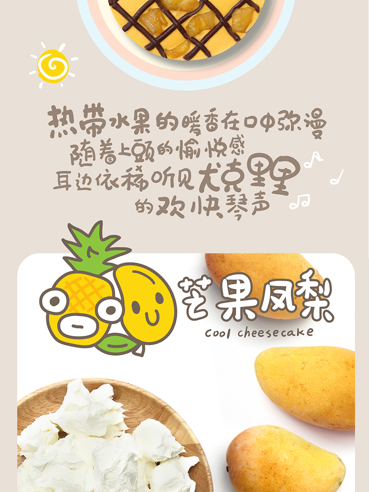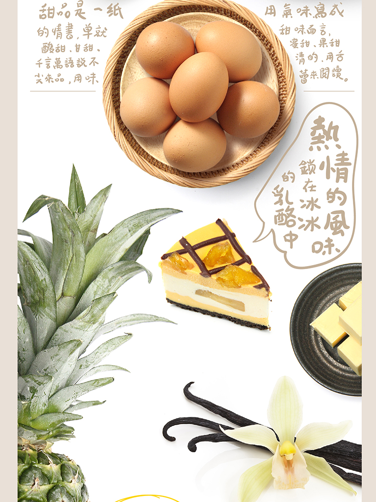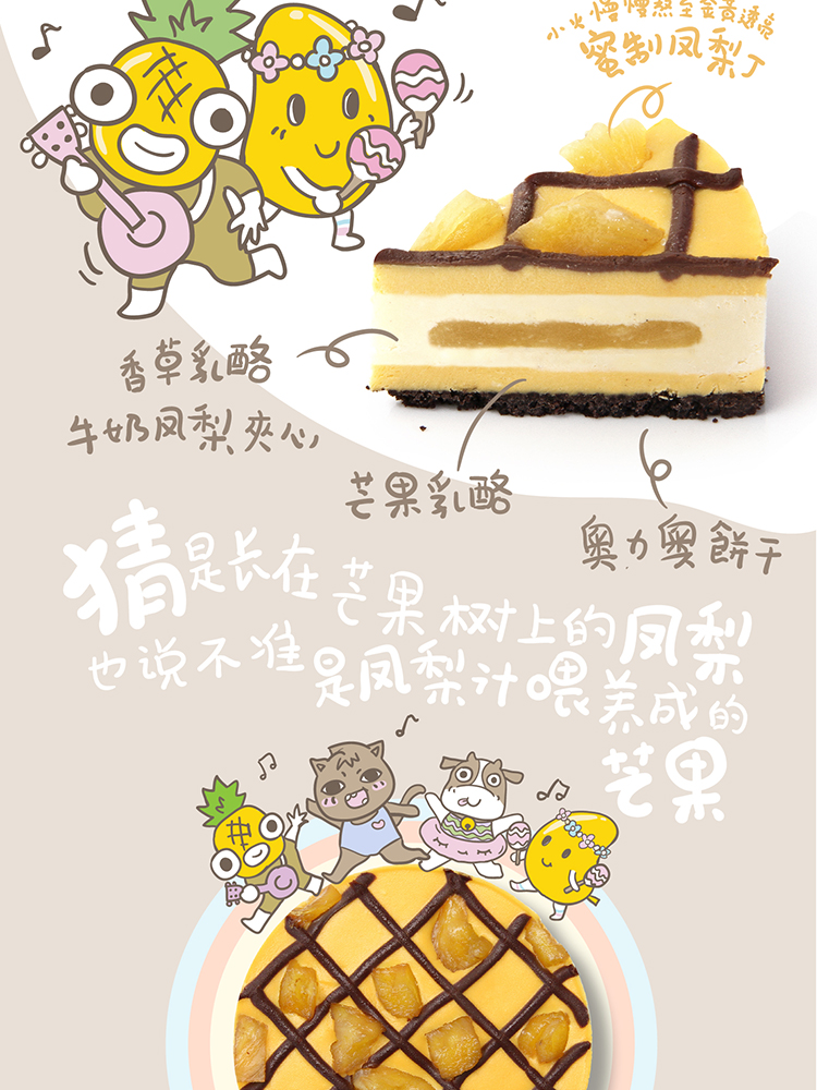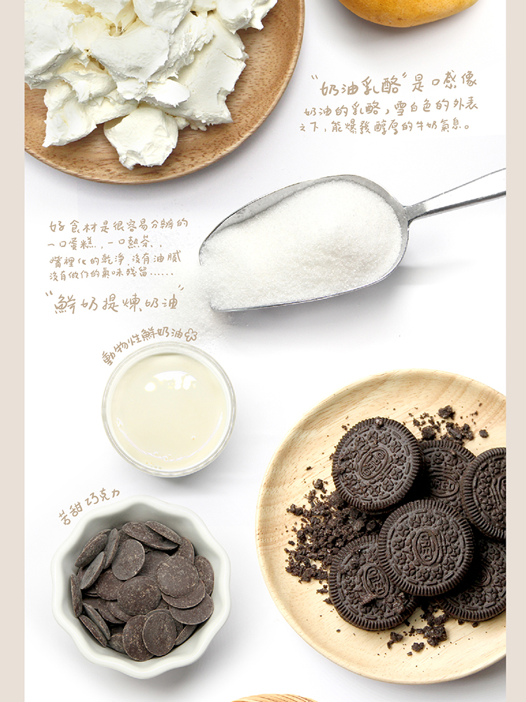 乳酪,幼砂糖,海藻糖,淡奶油,黄油,芒果果泥,凤梨,香草,牛奶巧克力,饼底:奥利奥饼干,黄油