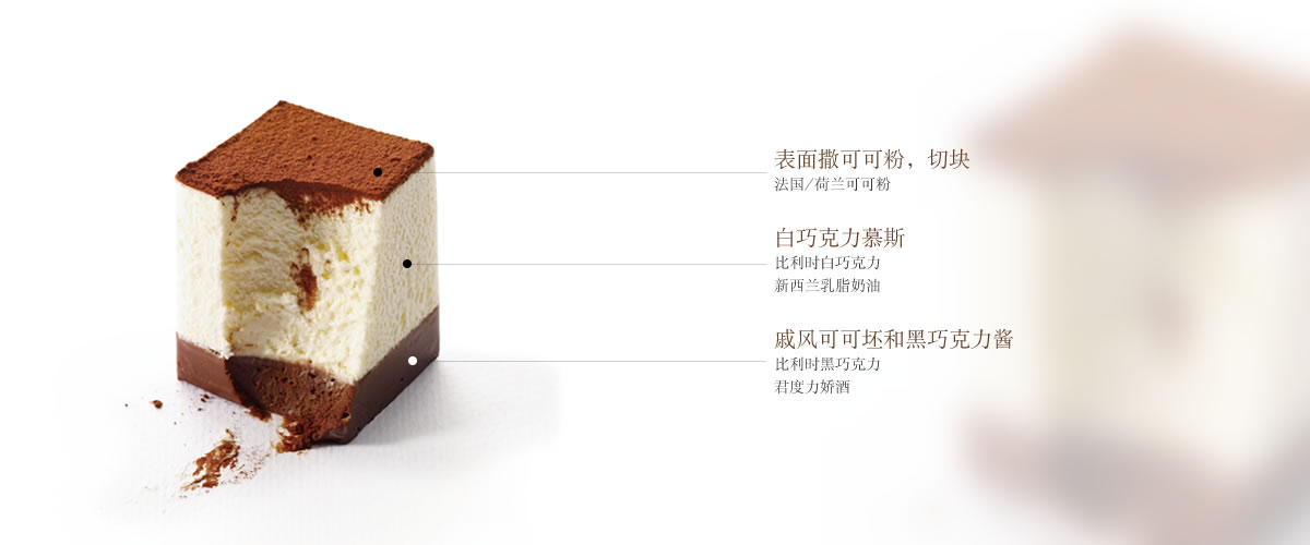口感冰凉细腻,白巧克力慕斯的甜,与底部黑巧克力酱的苦