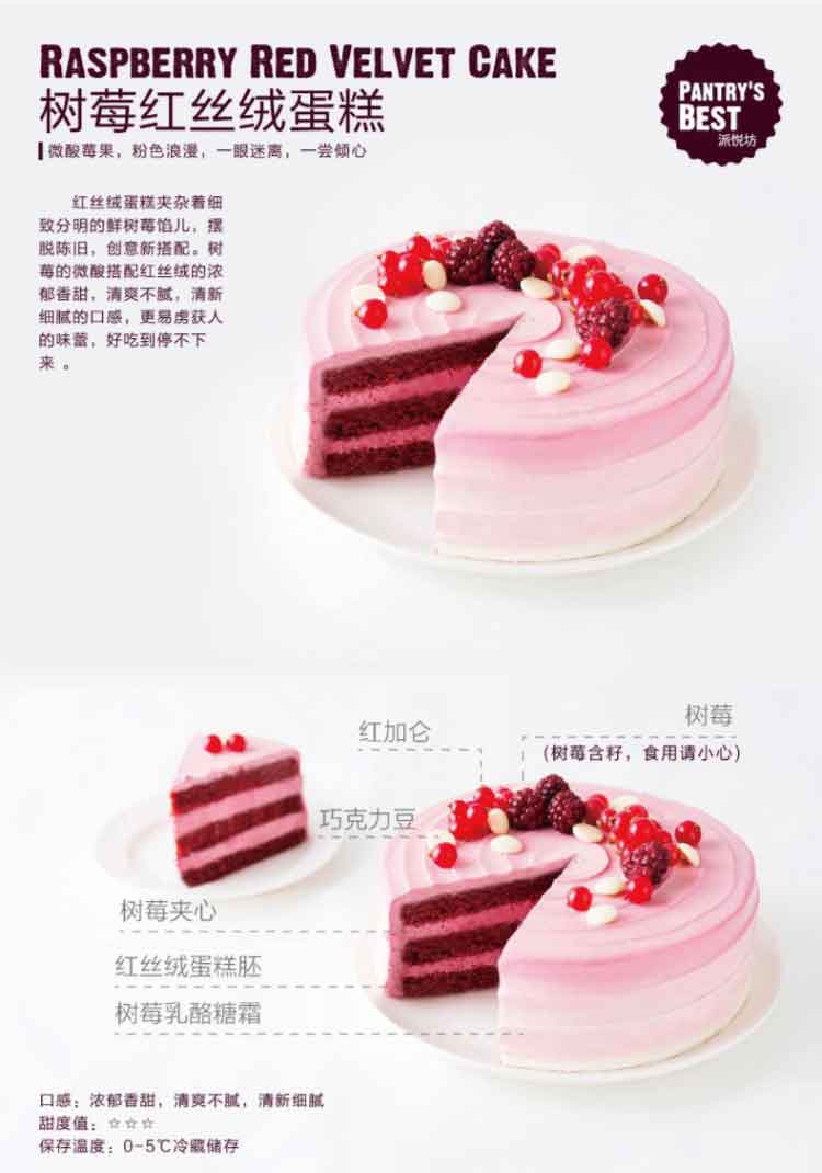 可可粉(法国)、奶油奶酪(澳大利亚)、黄油(新西兰)、乳脂奶油(法国)、树莓果蓉(法国)、树莓(中国)、红加仑(法国)、白巧克力( 比利时)、砂糖( 韩国)、糖粉(香港)、面粉(中国)、鸡蛋(中国)