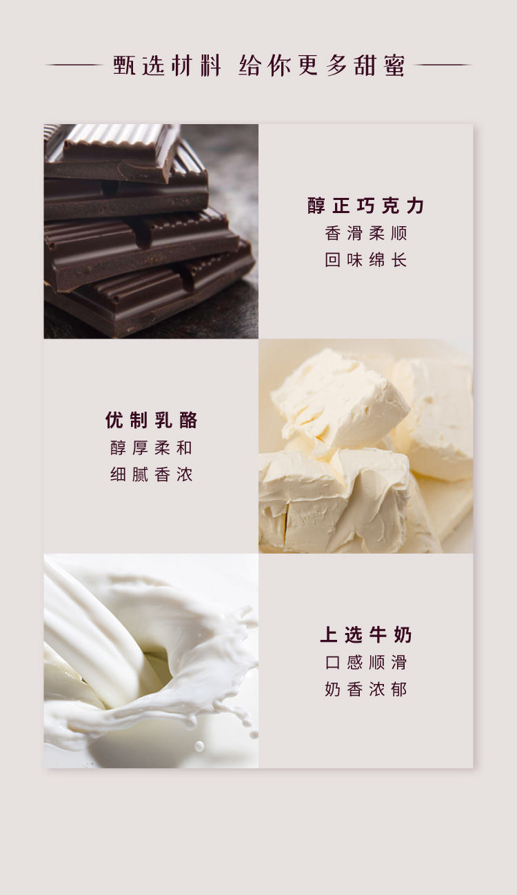 过敏原:含有蛋类(鸡蛋),乳制品(奶油奶酪,牛奶,黄油),麸质 (小麦),坚果(巴旦木粉),可可制品(可可粉,黑巧克力,原豆黑 巧克力,白巧克力)。